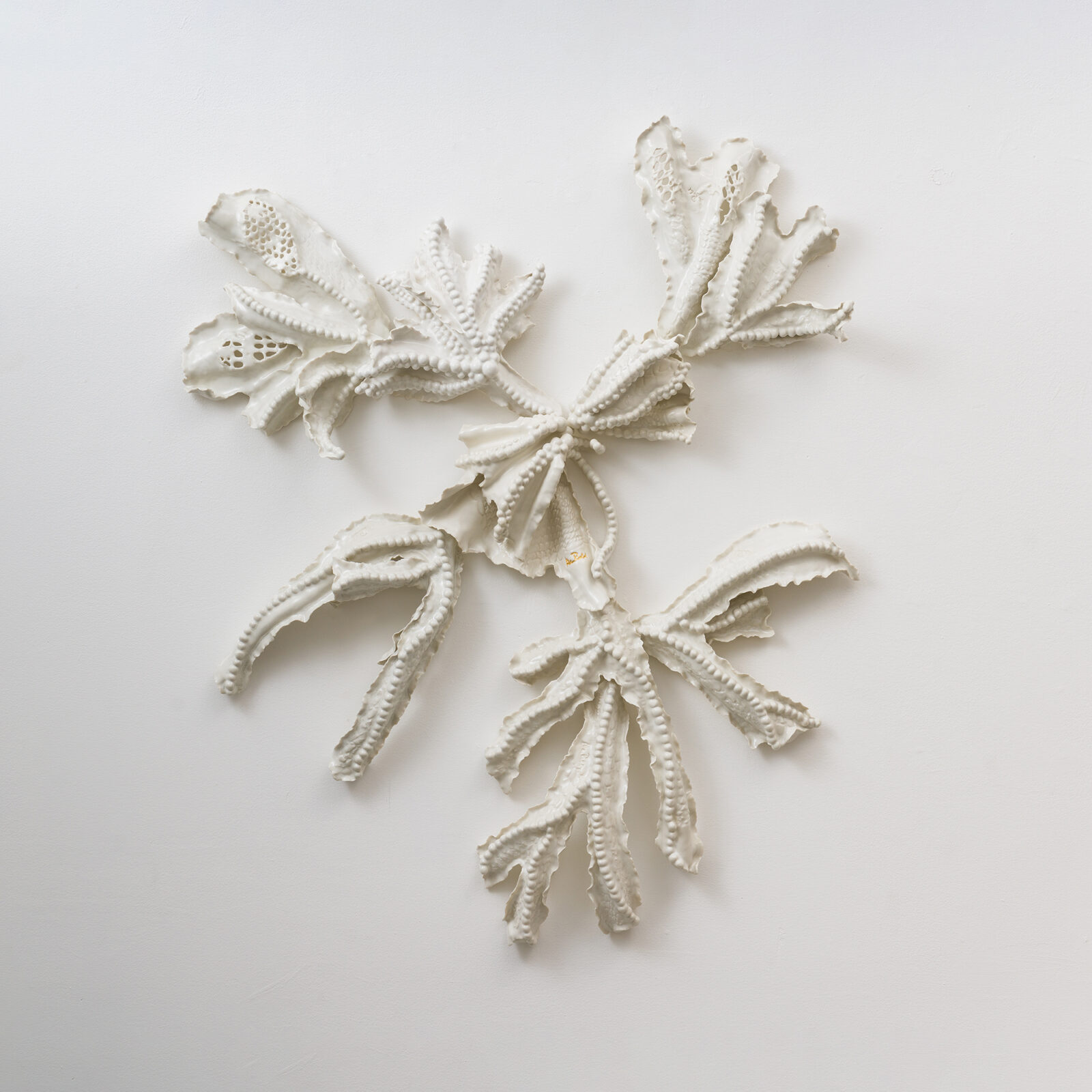 By combining French decorative arts motifs, organic imagery, and contemporary motivations into visual poetry, French artist Alice Riehl’s porcelain wall murals exist in a liminal space between the natural and constructed worlds. Nurtured by the memory of her grandmother’s needlework, Riehl explores the combination of porcelain and lace, working the peculiar texture of this marriage into a personal signature of her botanical inspired ceramic works.