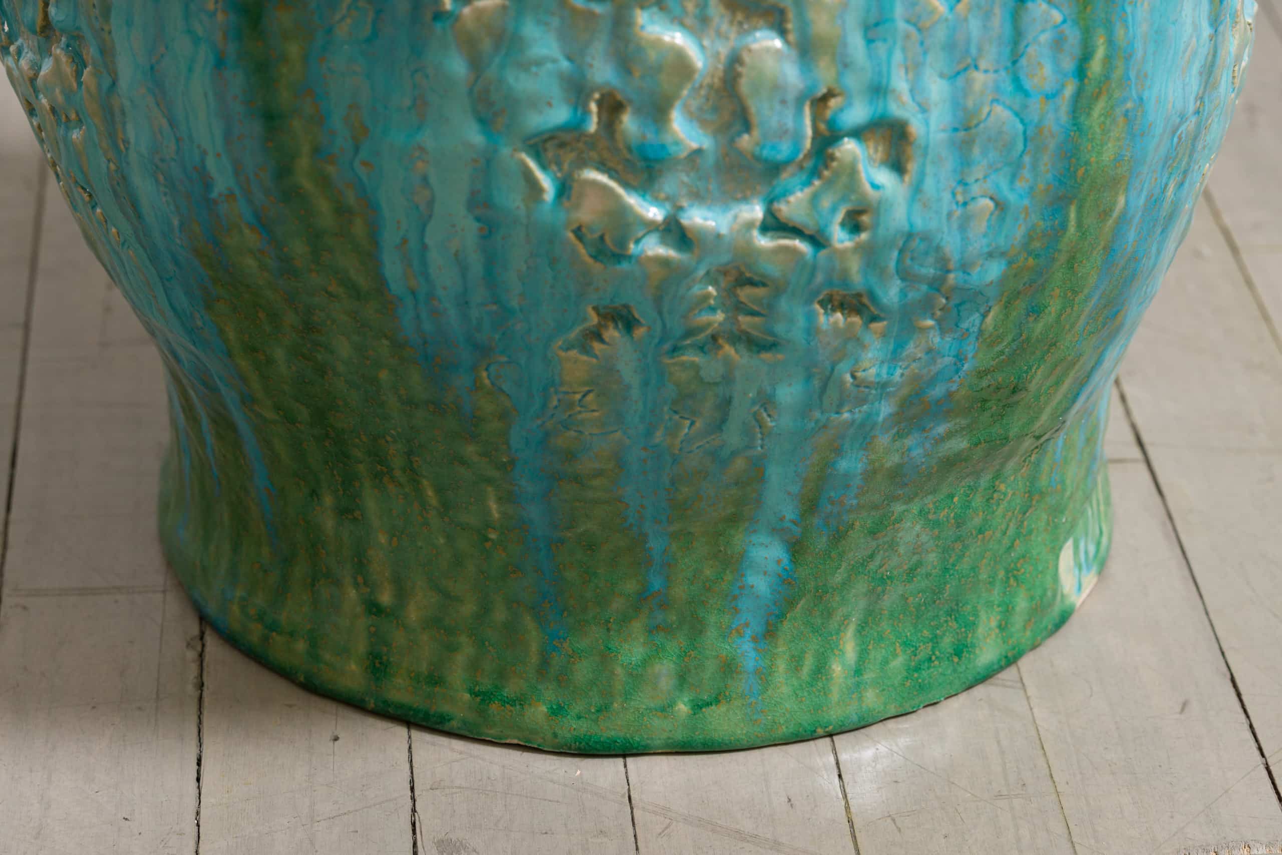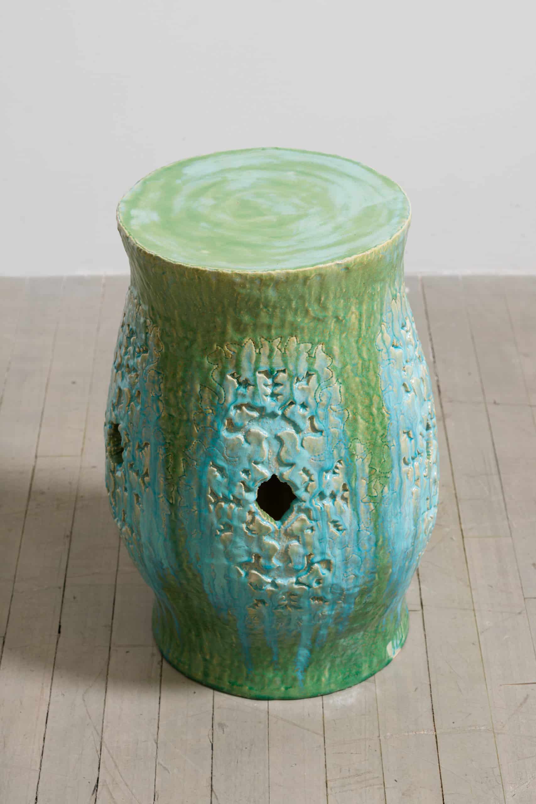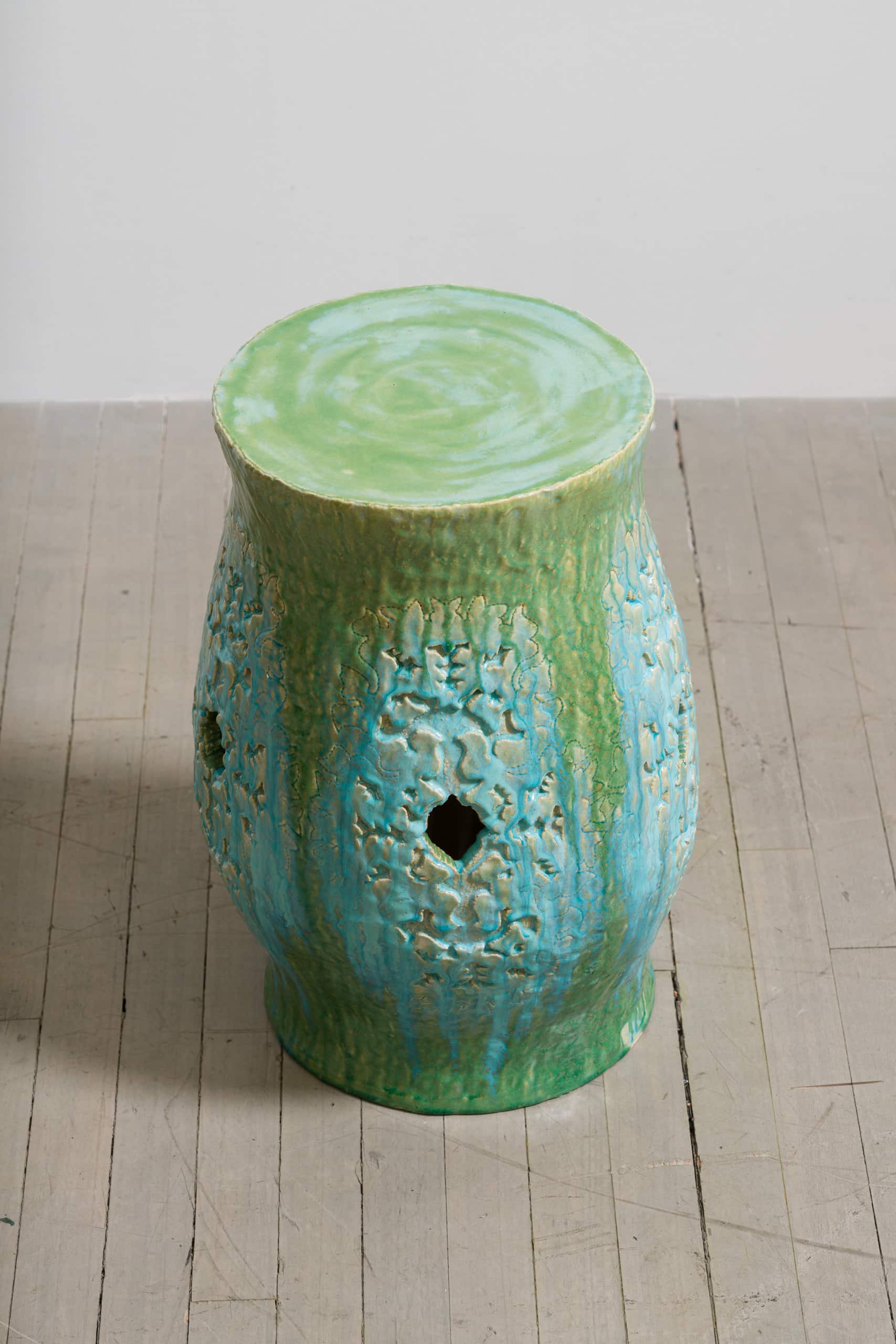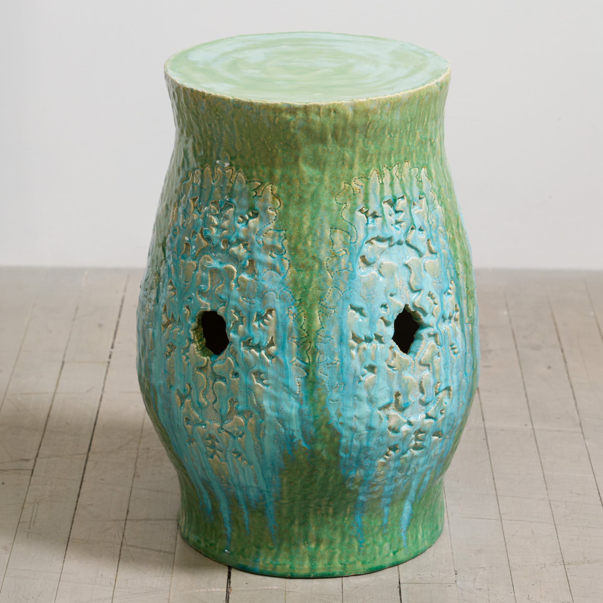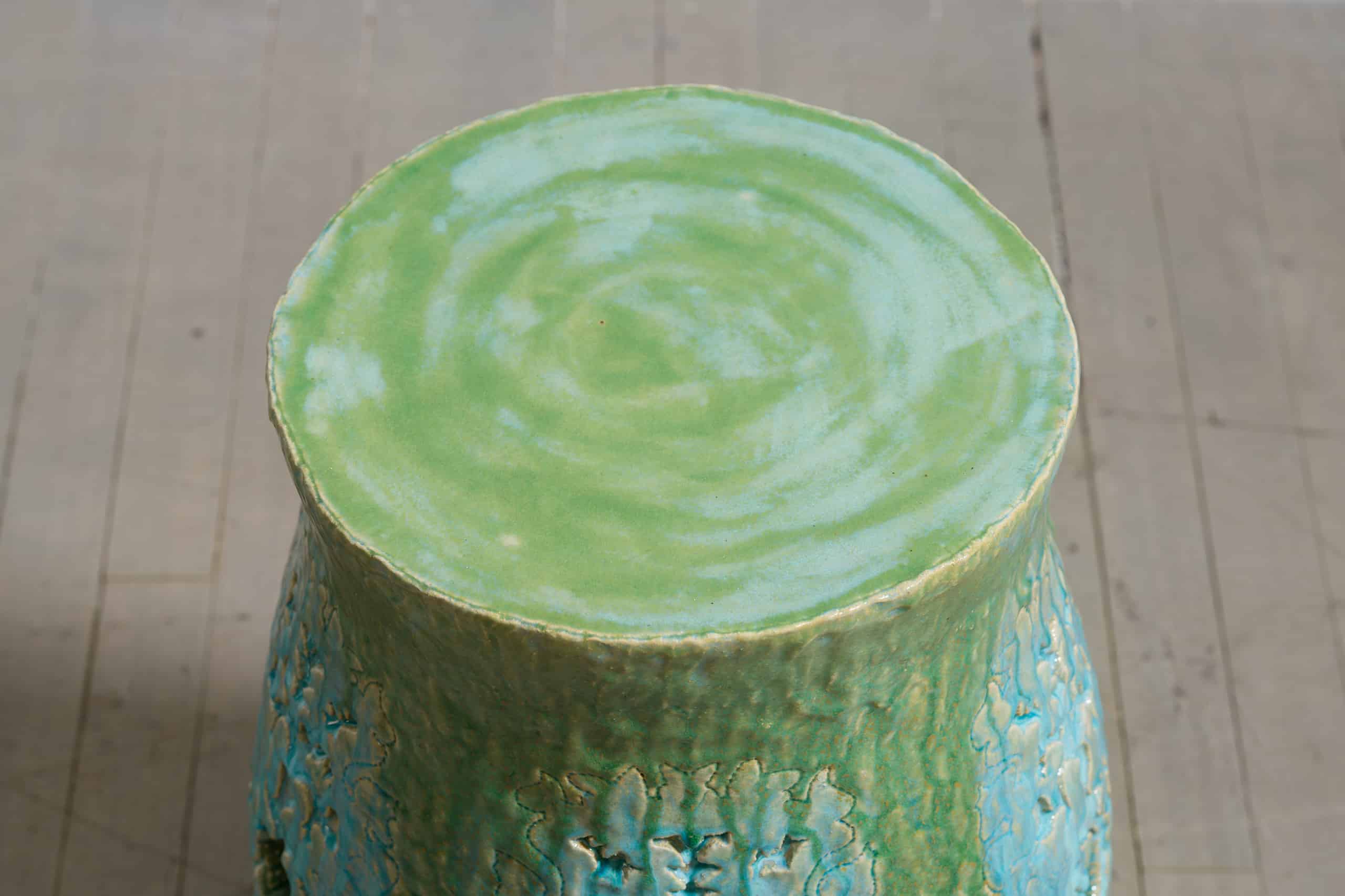 Marquis dedicated significant time to developing specialized low-temperature glazes, achieving a luminous finish that challenges the typically muted quality of such surfaces. Her palette draws directly from historically significant Asian ceramic traditions. Inย Garden Stool: Sancai, she references the vibrant three-color glazing technique of the Tang Dynasty from ancient China, presenting a copper glazeย accented with iron oxide and deep chocolate tones.ย Garden Stool: Celadon pays homage to the revered celadon glaze, long celebrated across Asian art history, which developed during the Eastern Han and Song dynasties, featuring a soft green glaze and subtle turquoise chun glaze highlights. Meanwhile,ย Garden Stool: Green (Luse de)ย features a teal base enriched by metallic black accents, offering a more contemporary interpretation of historical glazing traditions.