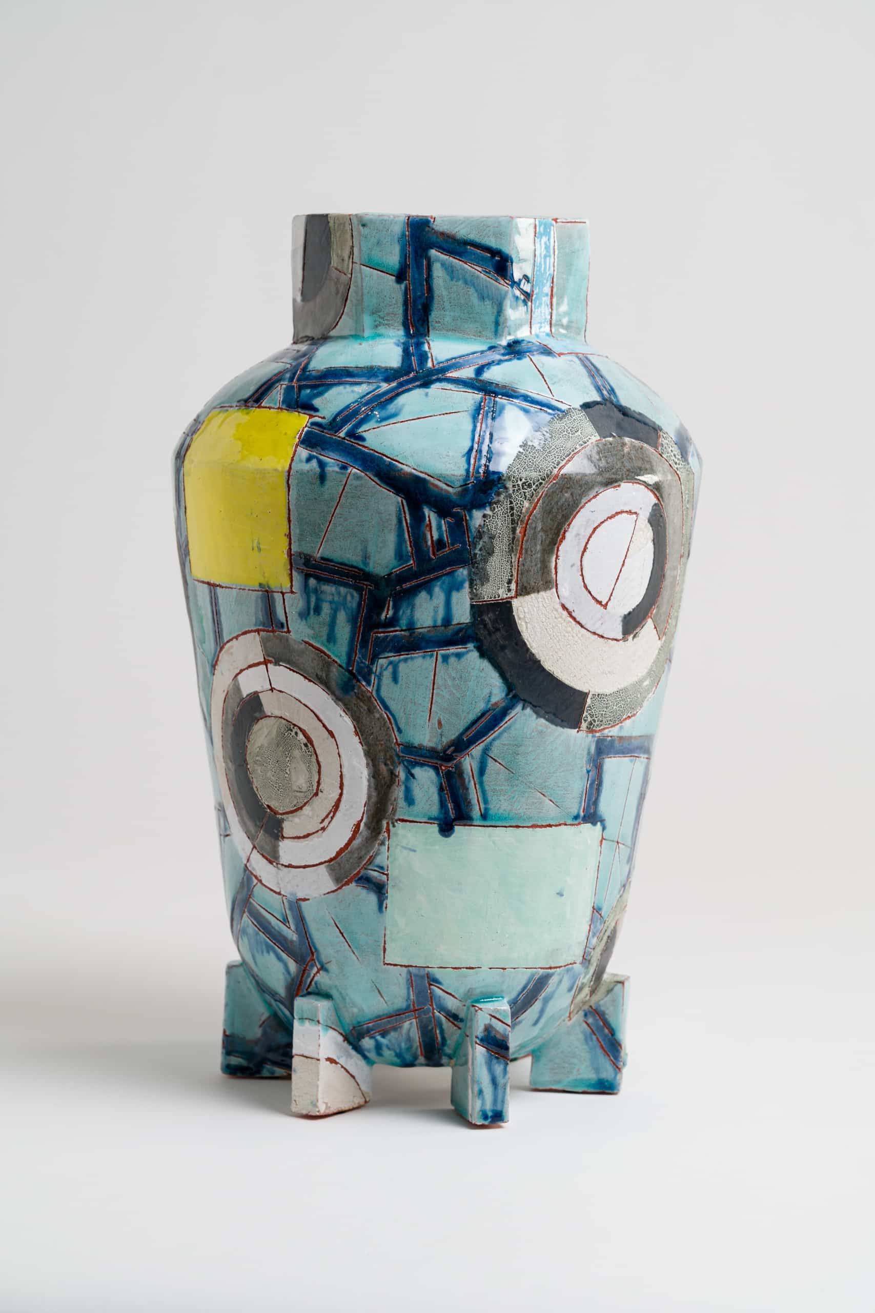Most notable in the recent works is Russellโs energetic surface ornamentation. Patchworks of simple shapes, in hues ranging from natural to artificial, jostle and hug to create cubist patterns akin to pictographs. A combination of black and white underglazes acts as a ground for his precise application of colored glazes, each individually developed by the artist. Employing stencil resists and decorative sgraffito results in work with an unexpected sense of depth.
