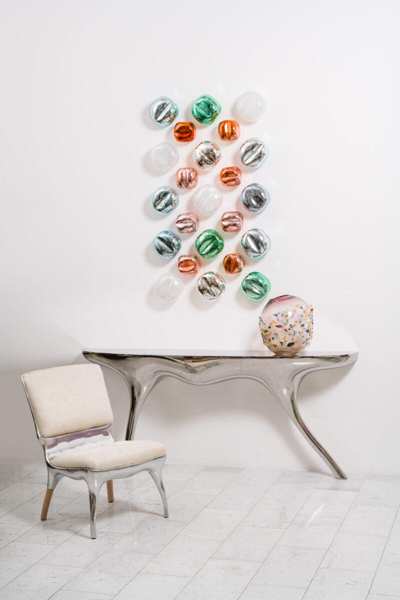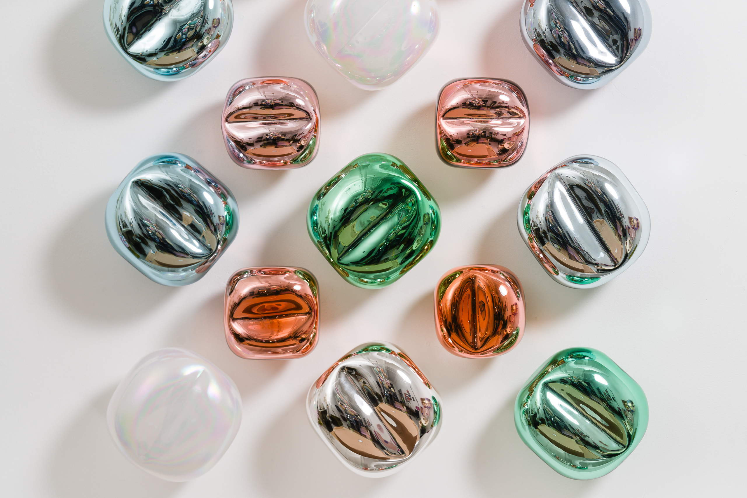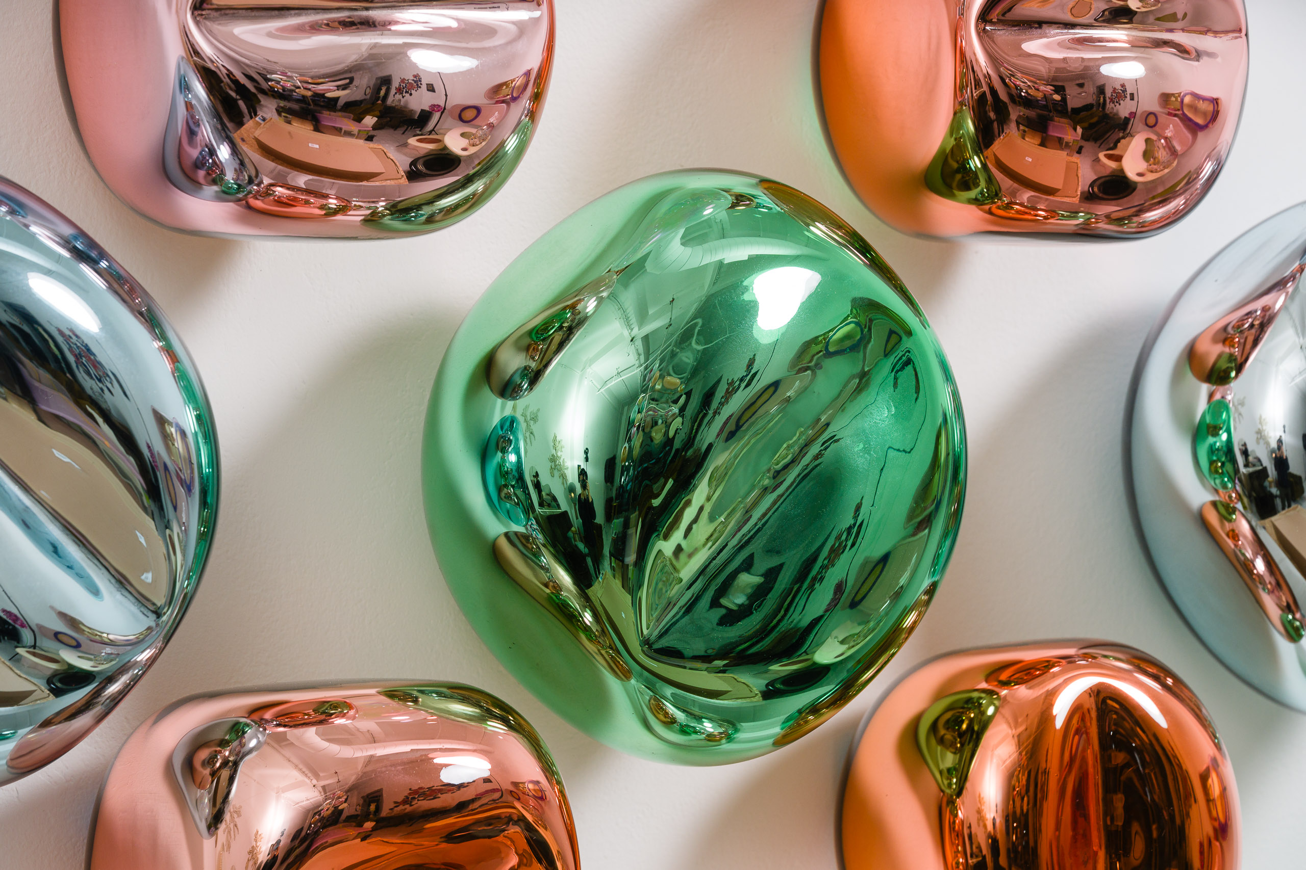 Jamie Harrisโ Dimpled wall installations play on the tension between the constraint of the geometric forms and the undulation of the slashed surfaces. ย The mirroring sensuously highlights the sculpted forms while allowing the colored surfaces to bounce off of each other, allowing the color to blend between the glass forms and their environment.