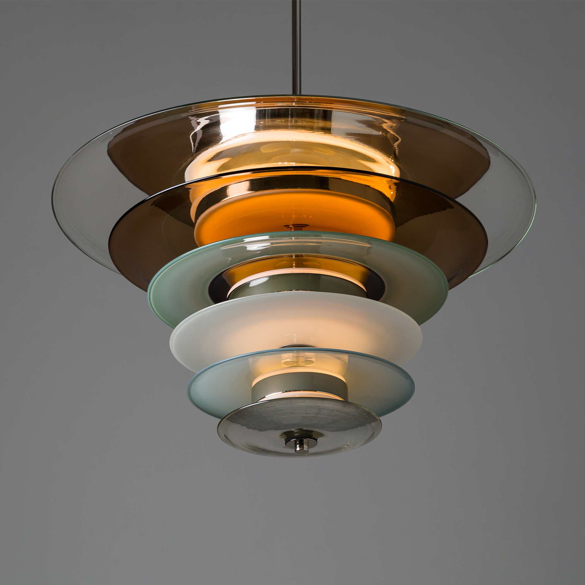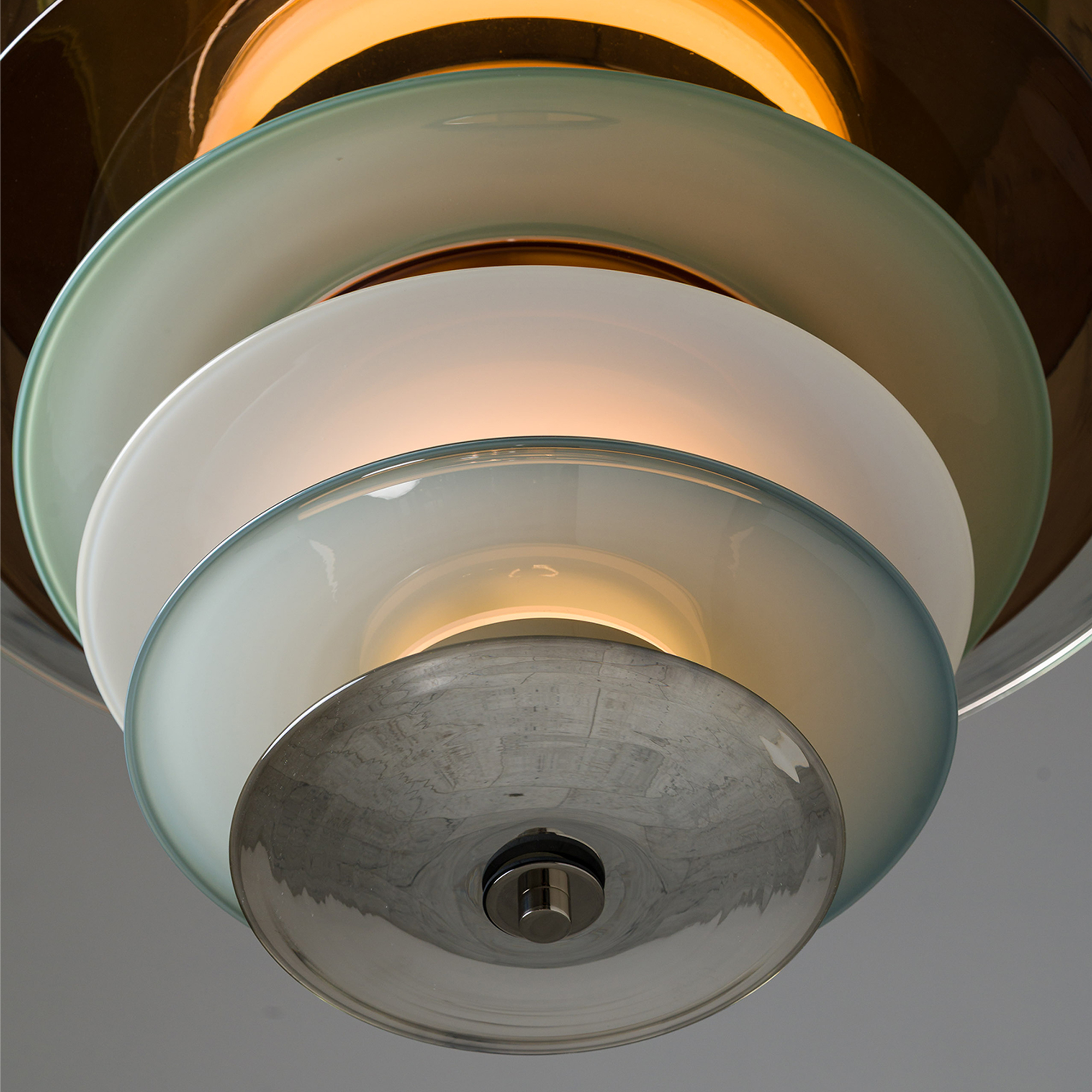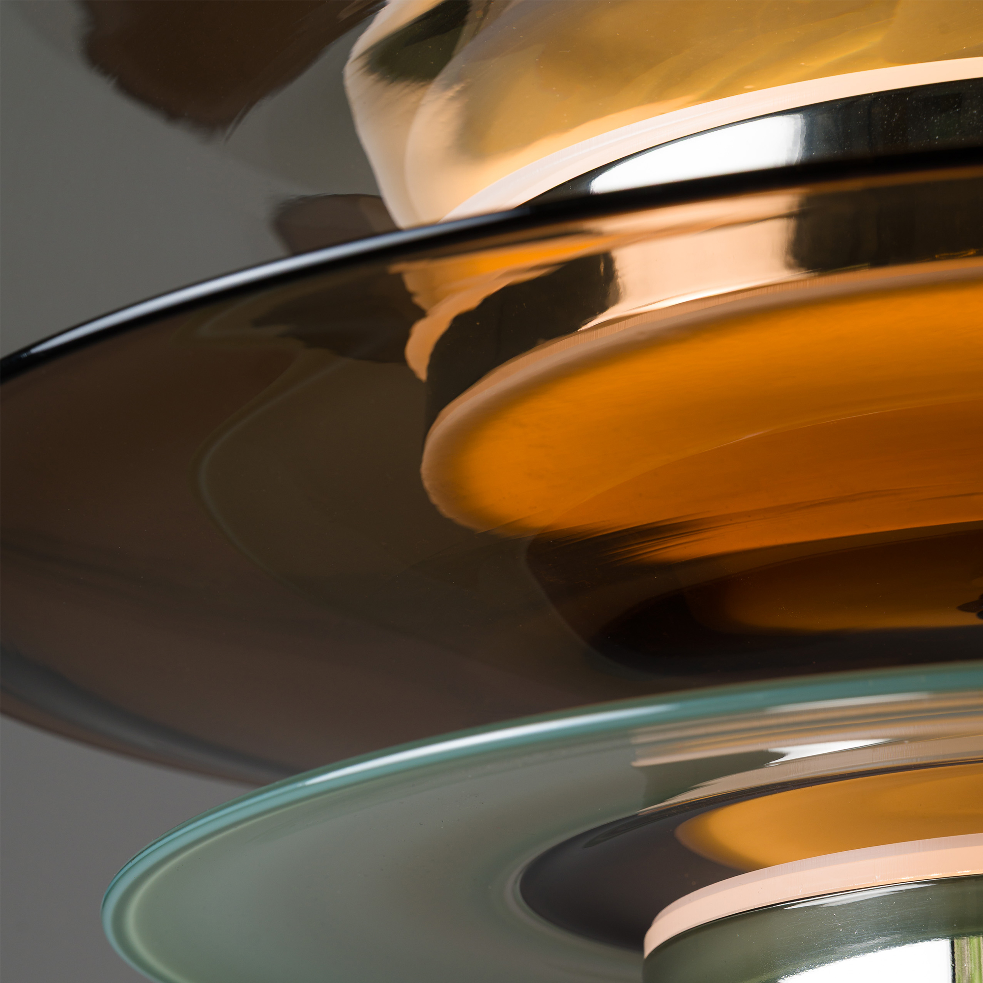 Today in addition to his fine art glass sculptures, Jamie Harris is creating unique, hand-made sculptural lighting. His Nested Disc series plays on layered geometries to create sophisticated lighting structures built from tiered levels of blown glass roundel forms. Ranging in sizes up to 36 inches, each organically shaped roundel is meticulously sized, its color chosen to interact with the neighboring level. As you walk around the piece, light bounces and cascades down, blending each shade while also responding to the surrounding light environment. By altering the opacity, hue, employing metallic finishes, or creating opalescent and iridescent surfaces, the works can sit at either ends of the spectrum from minimal to extravagant. Available by commission, each work is unique and fully customizable, from layout, sizing, coloration and finish.