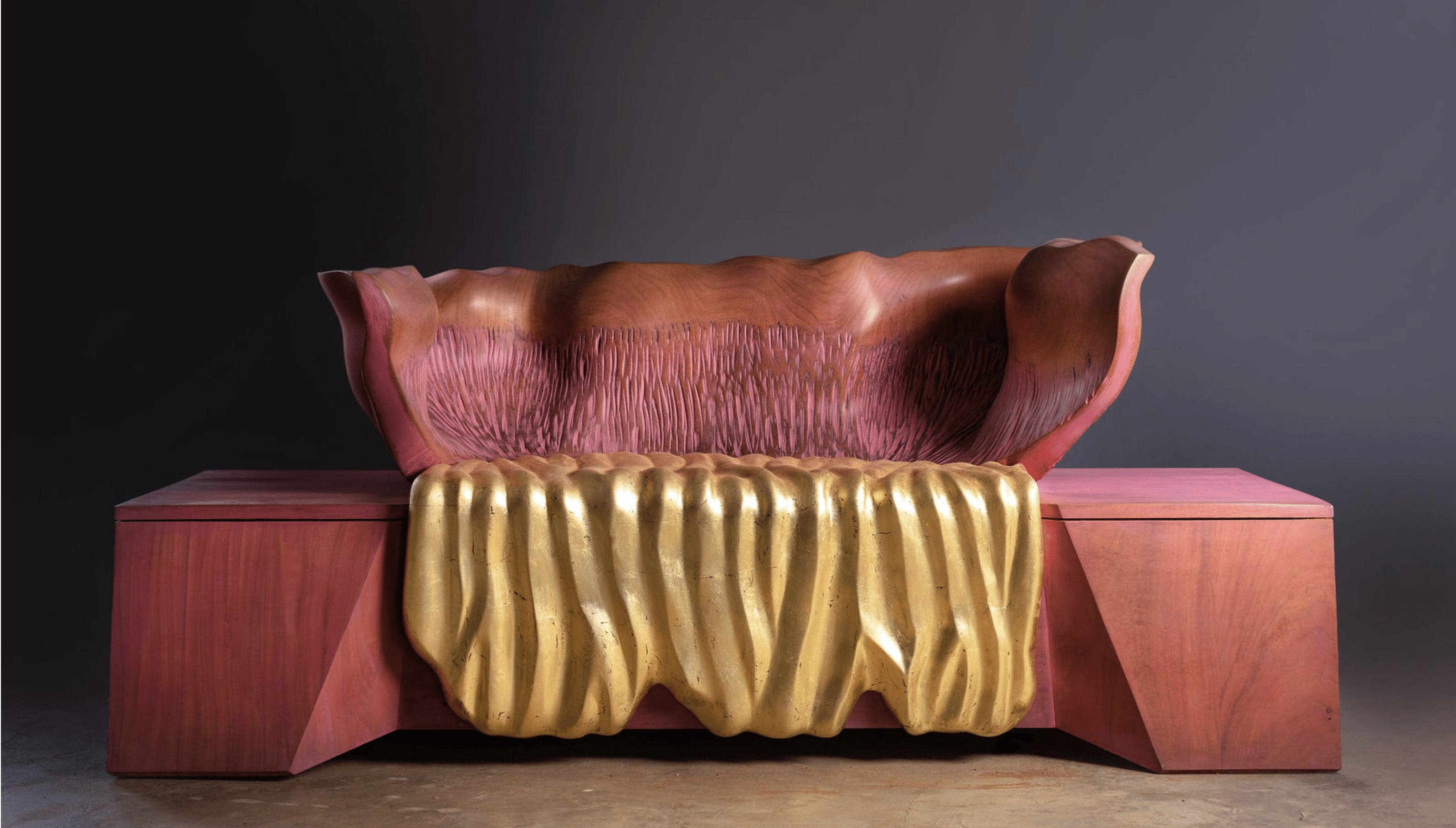 At Design Miami, Todd Merrill Studio debuts the sculptural Cloud Bench, carved and painted in the a radiant raspberry and gold leaf palette, it is a work that is at once somber, fantastical, and conceptually far-reaching.