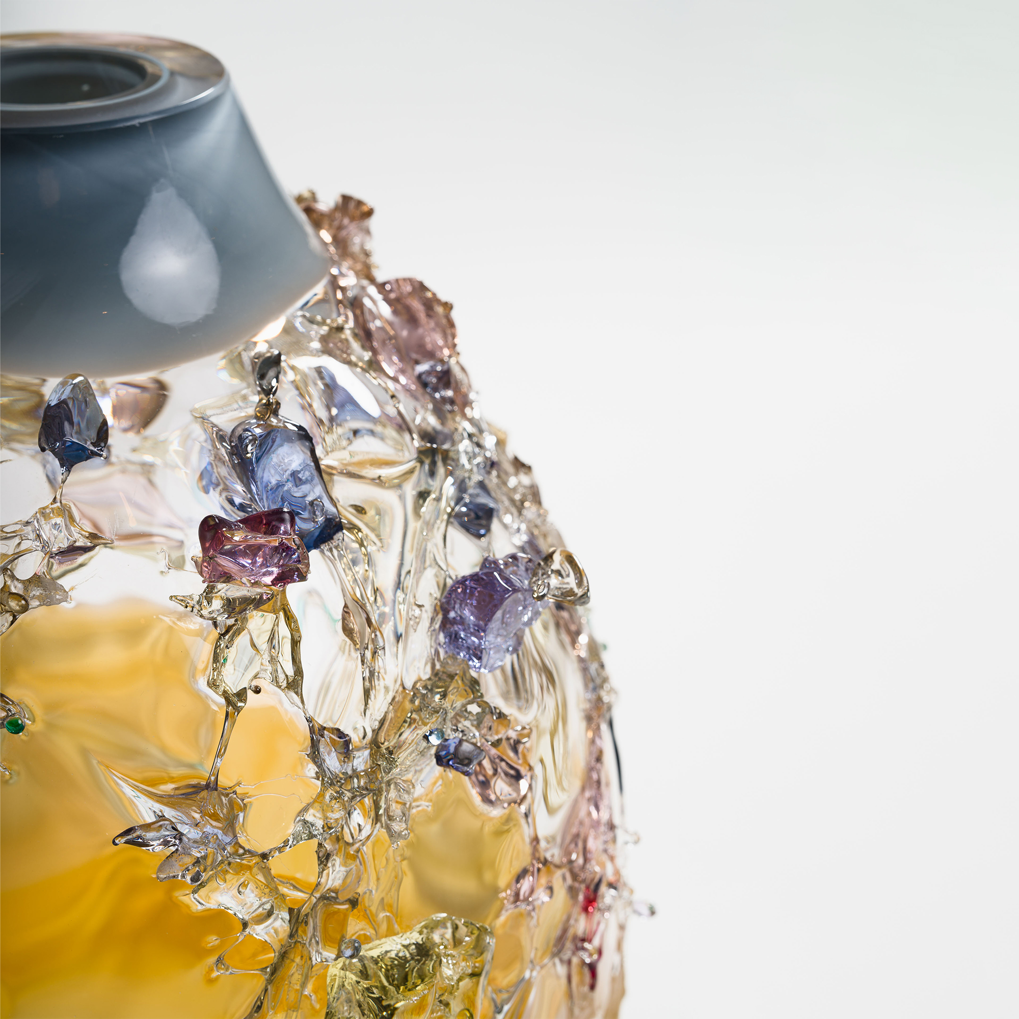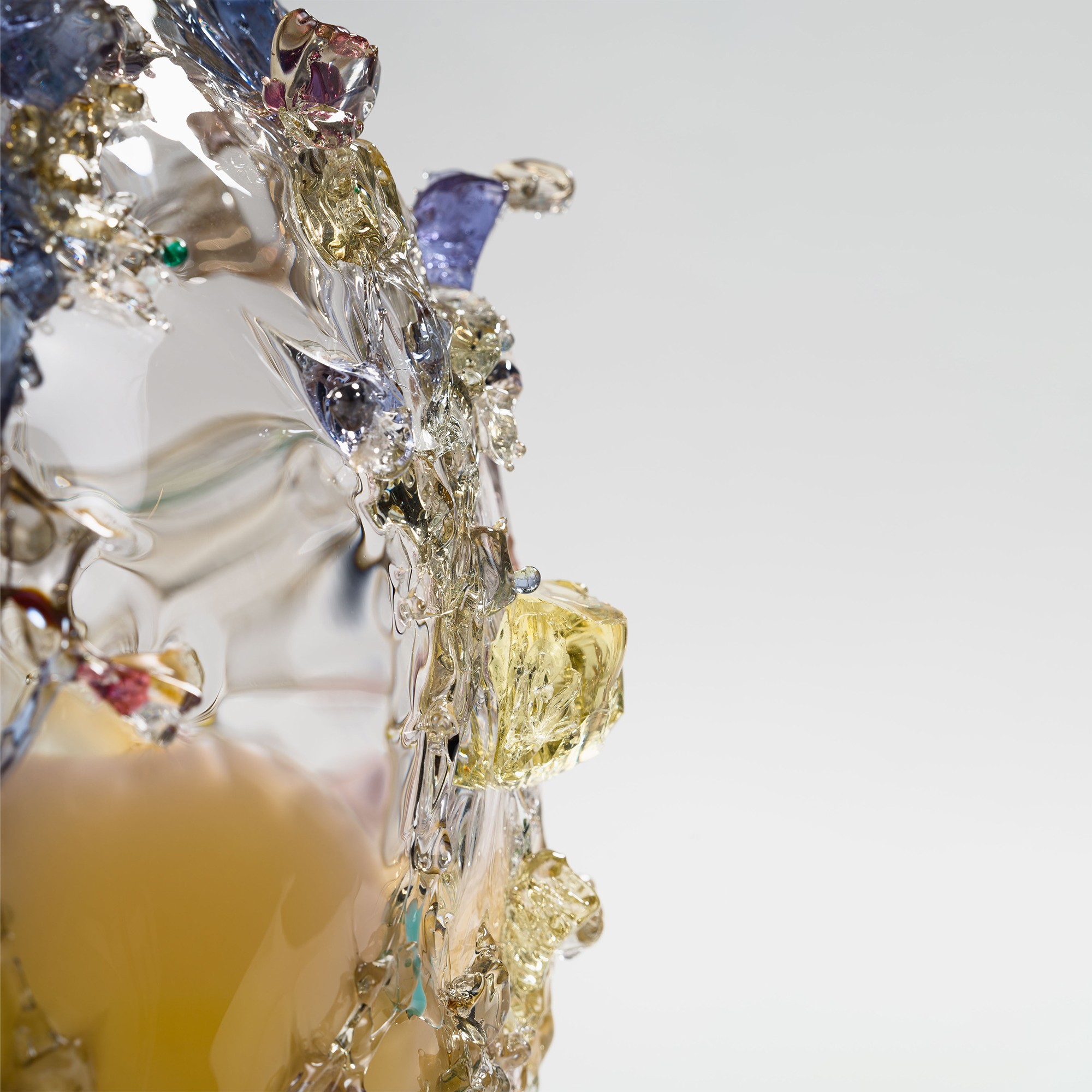 The volatility in accomplishing the exceptional thickness of his vases creates a risky balance between strength and delicacy. The thermal stress caused when trying to equalize the interior and exterior temperature of the cooling vessels, is fraught with the propensity for breakage. The success of Vrolijk’s works lie in the crystalline clarity posed against their substantial physical impact.
