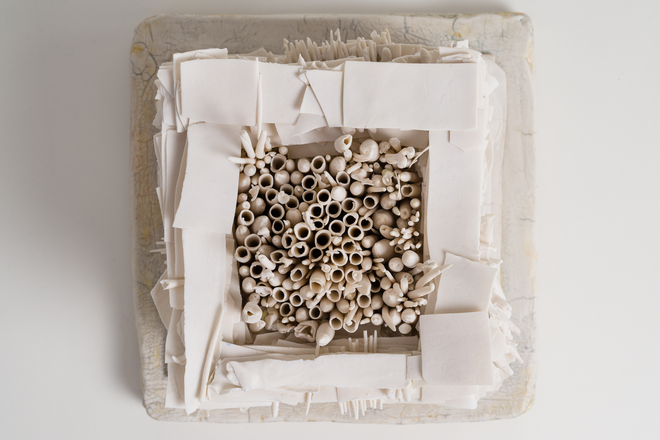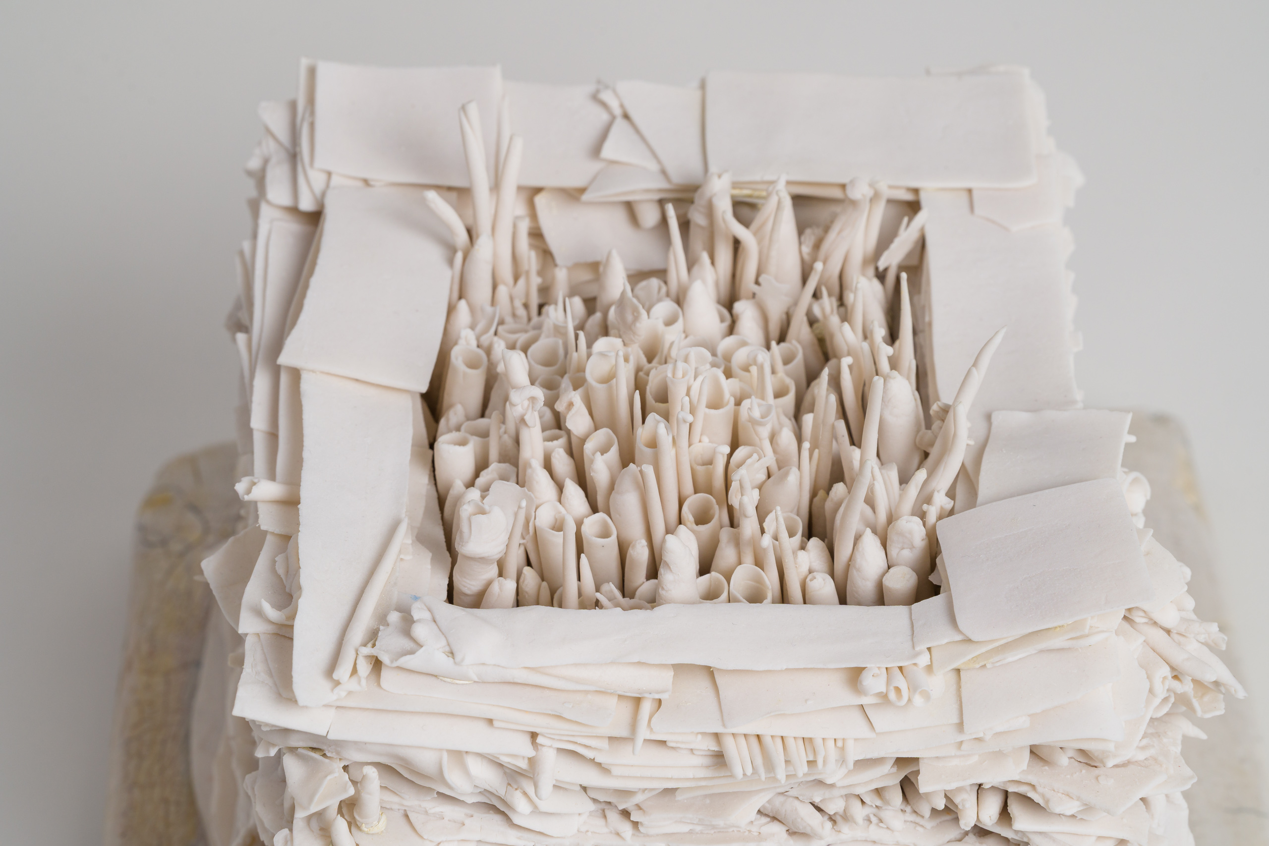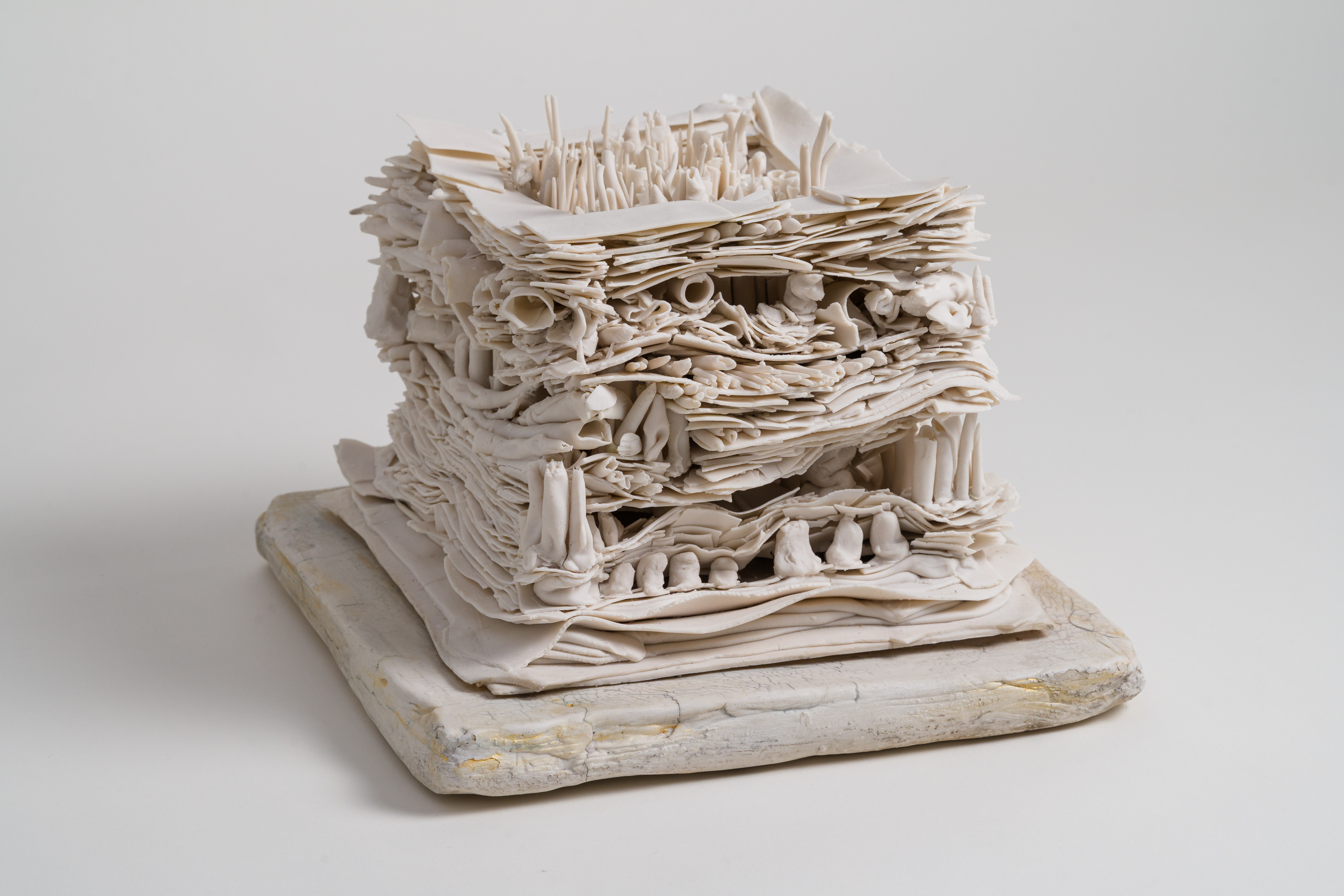 Composed of countless hand-formed layers, rolls, and coils delicately stacked within a square format, Temple embodies Mindy Horn’s poetic balance between structure and spirit. Architectural yet ethereal, grounded yet timeless, the work rises like a sacred ruin. Its fragile strata evoke both the persistence of form and the inevitability of transformation.