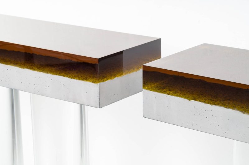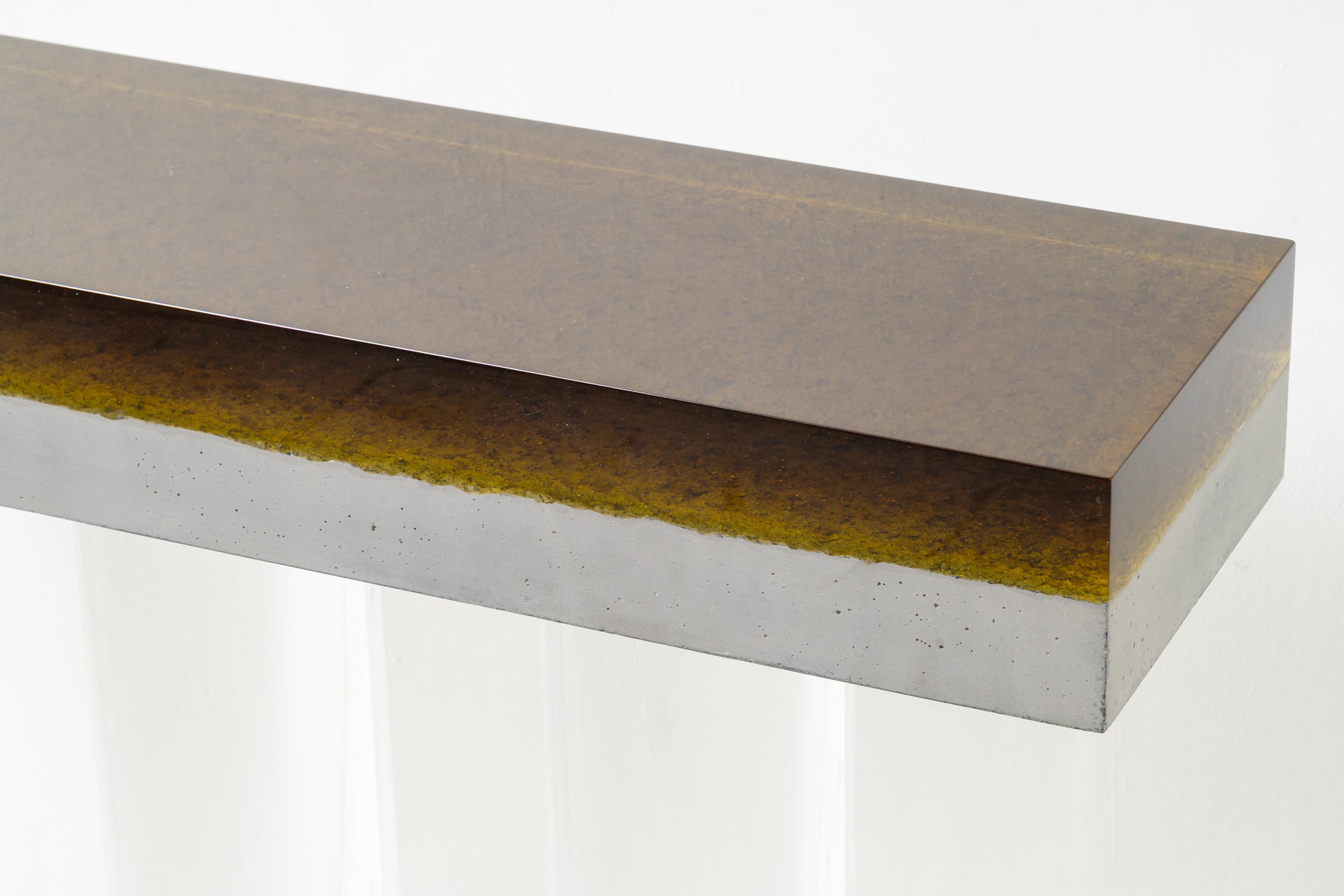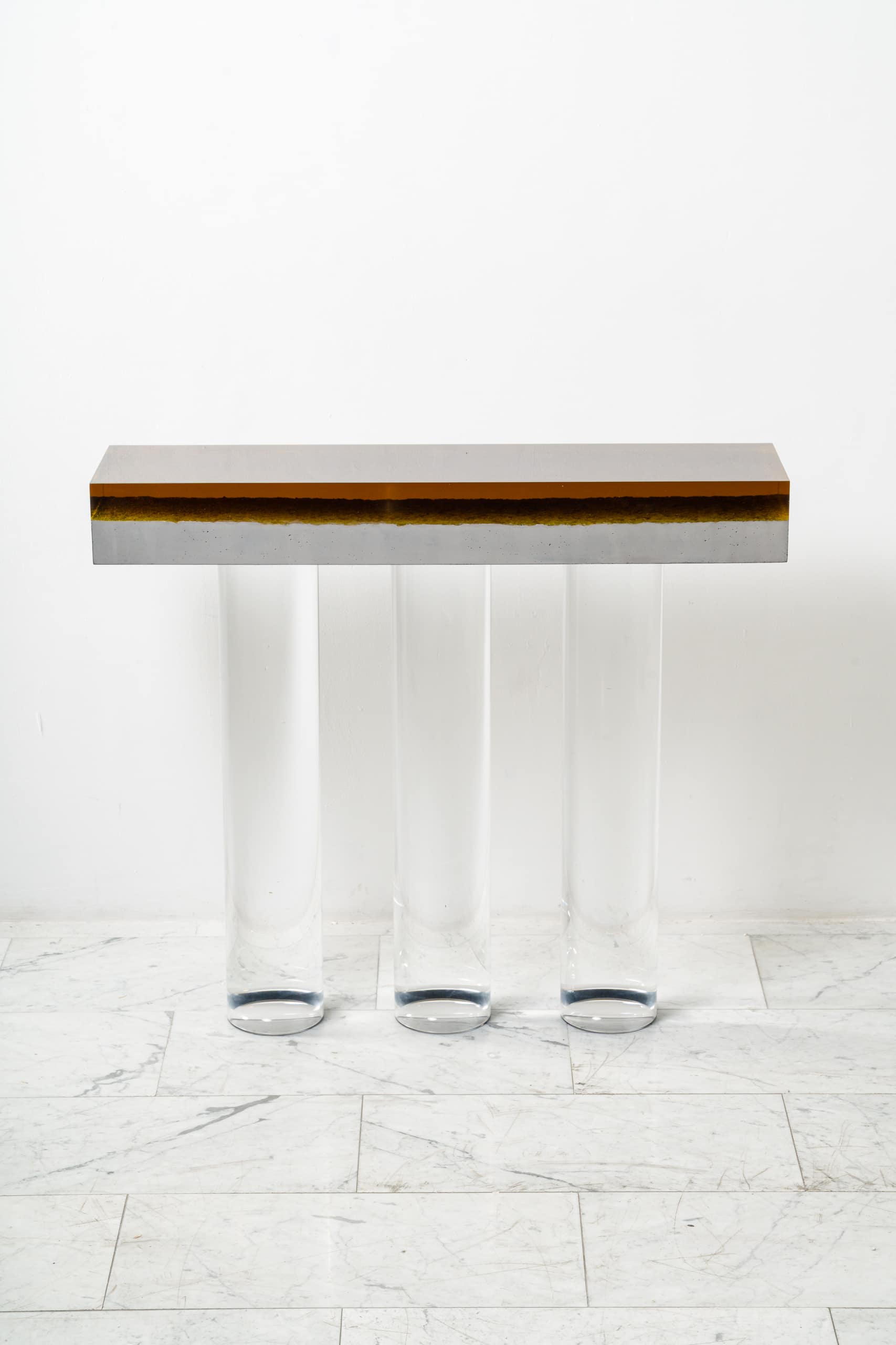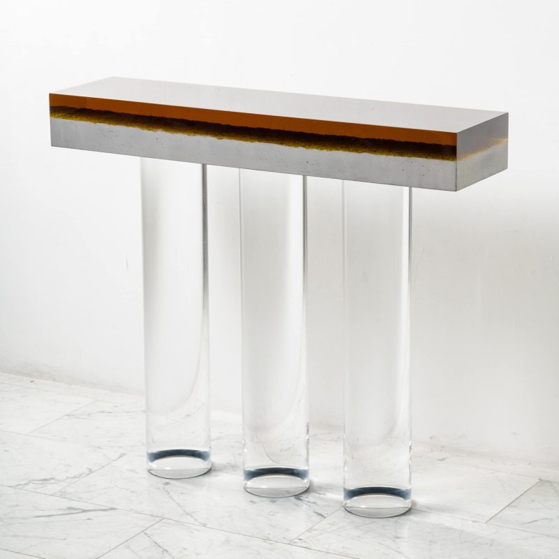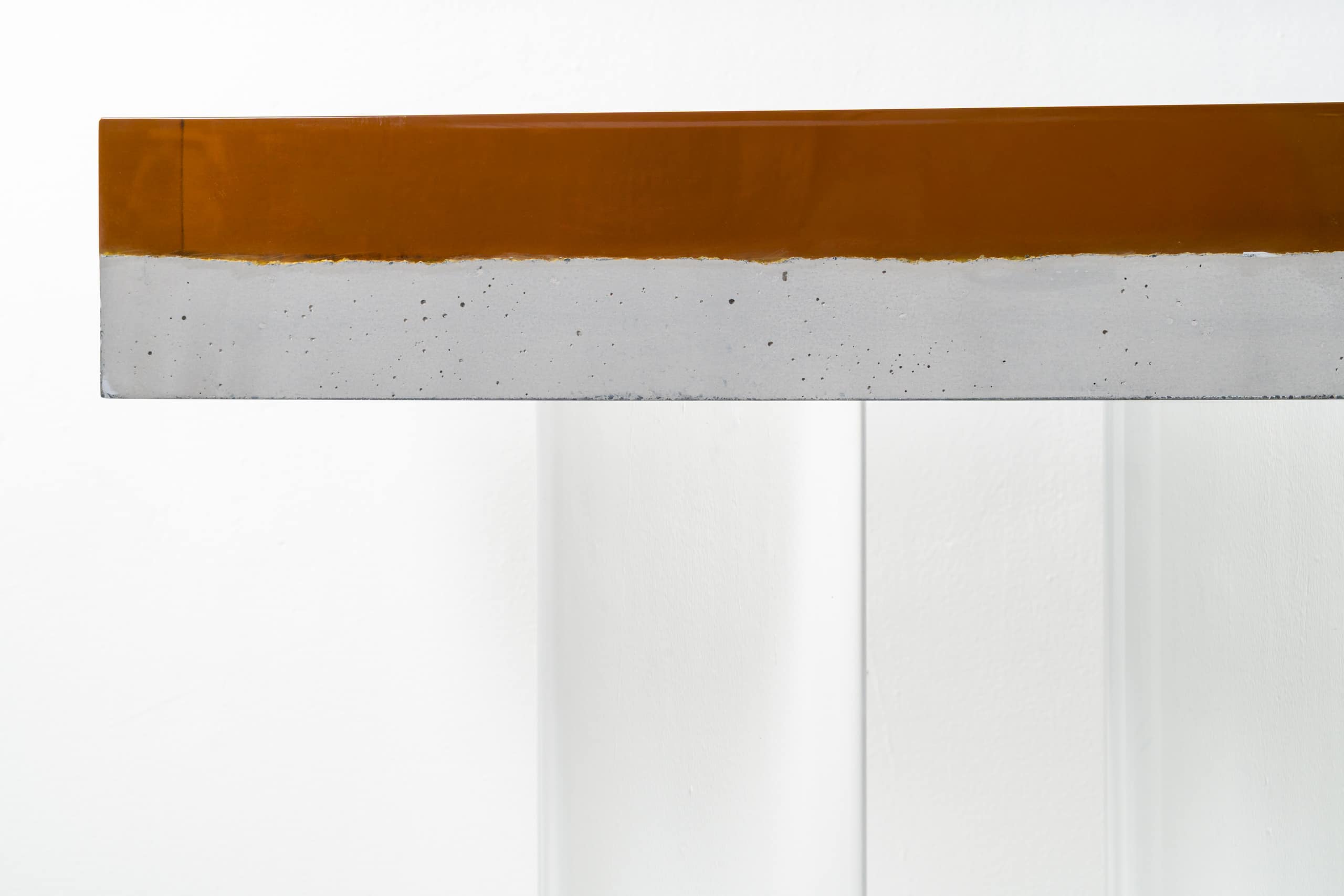 Known for their transparent works created in crystal clear resin, design duo Draga & Aurelโs Baia console plays with materials and geometric shapes for a pure, almost primordial composition. The thick, colored resin creates depth in juxtaposition with the rough concrete. The legs in lucite are transparent and colorless, a solution that emphasizes the objectโs monumentality while maintaining the compositionโs lightness.
