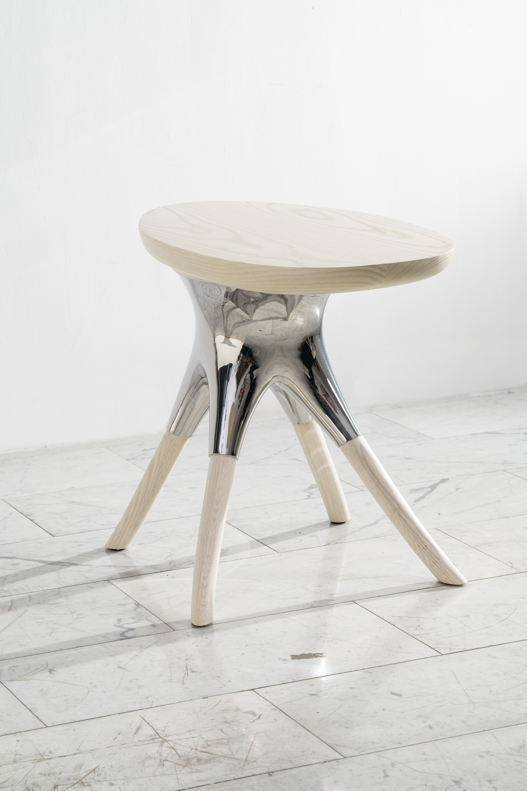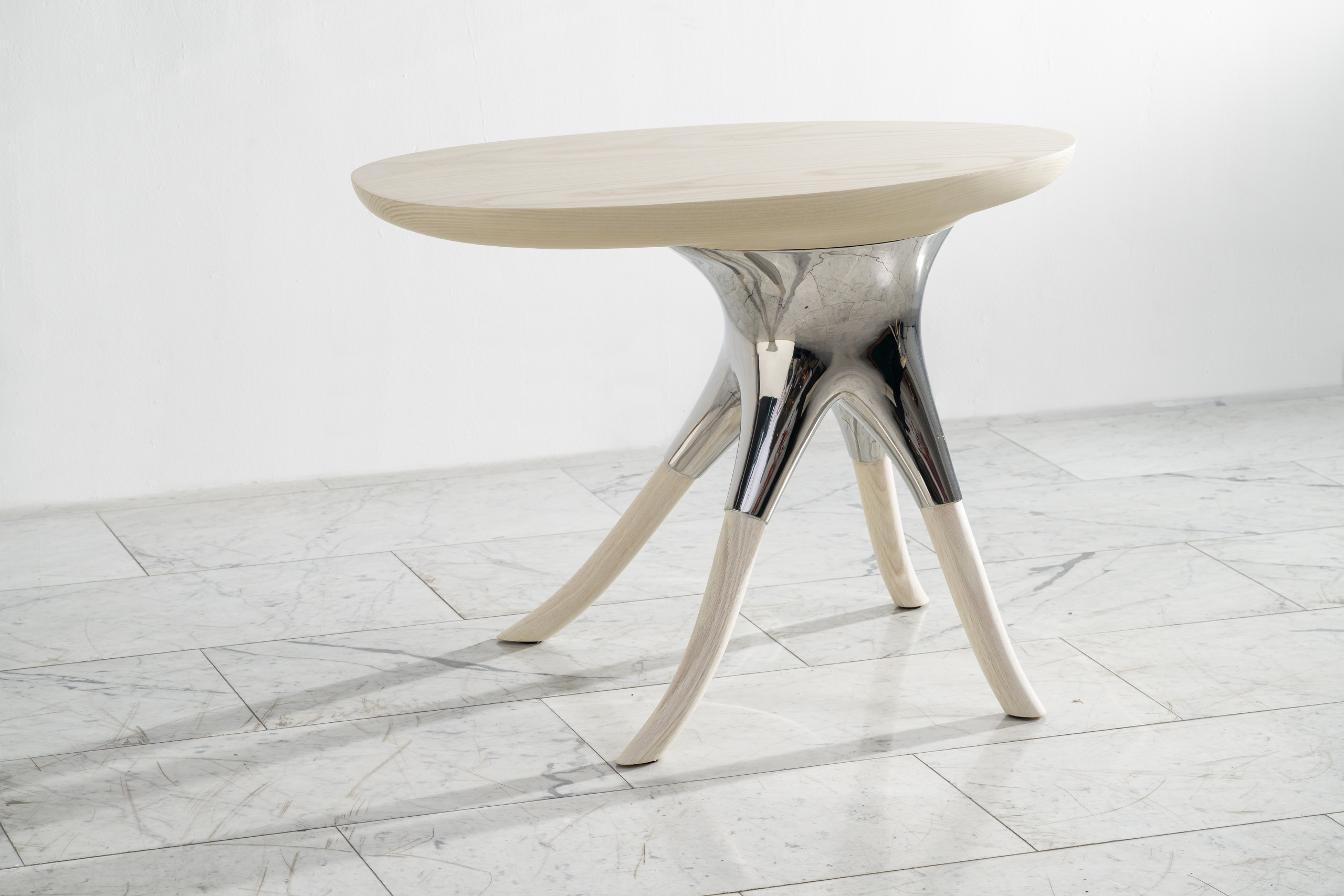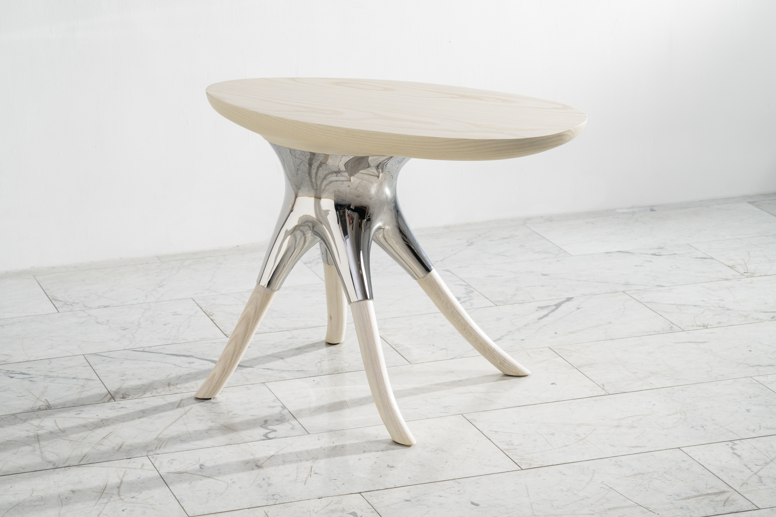 Alex Roskin, Racine Side Table in Stainless Steel, Ash and Oak, USA, 2025