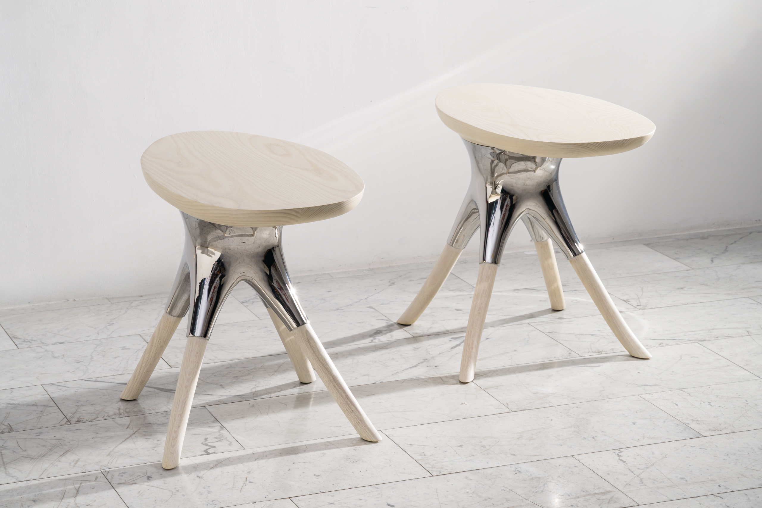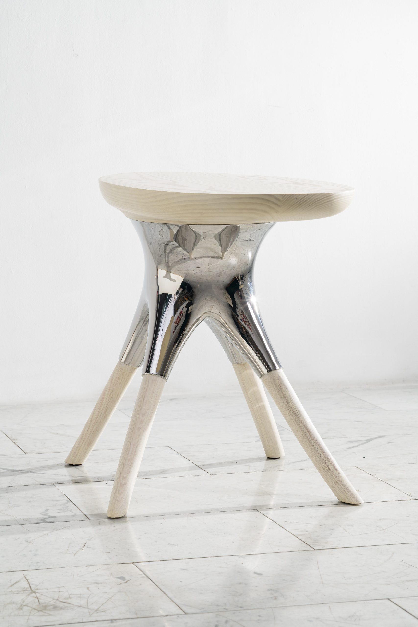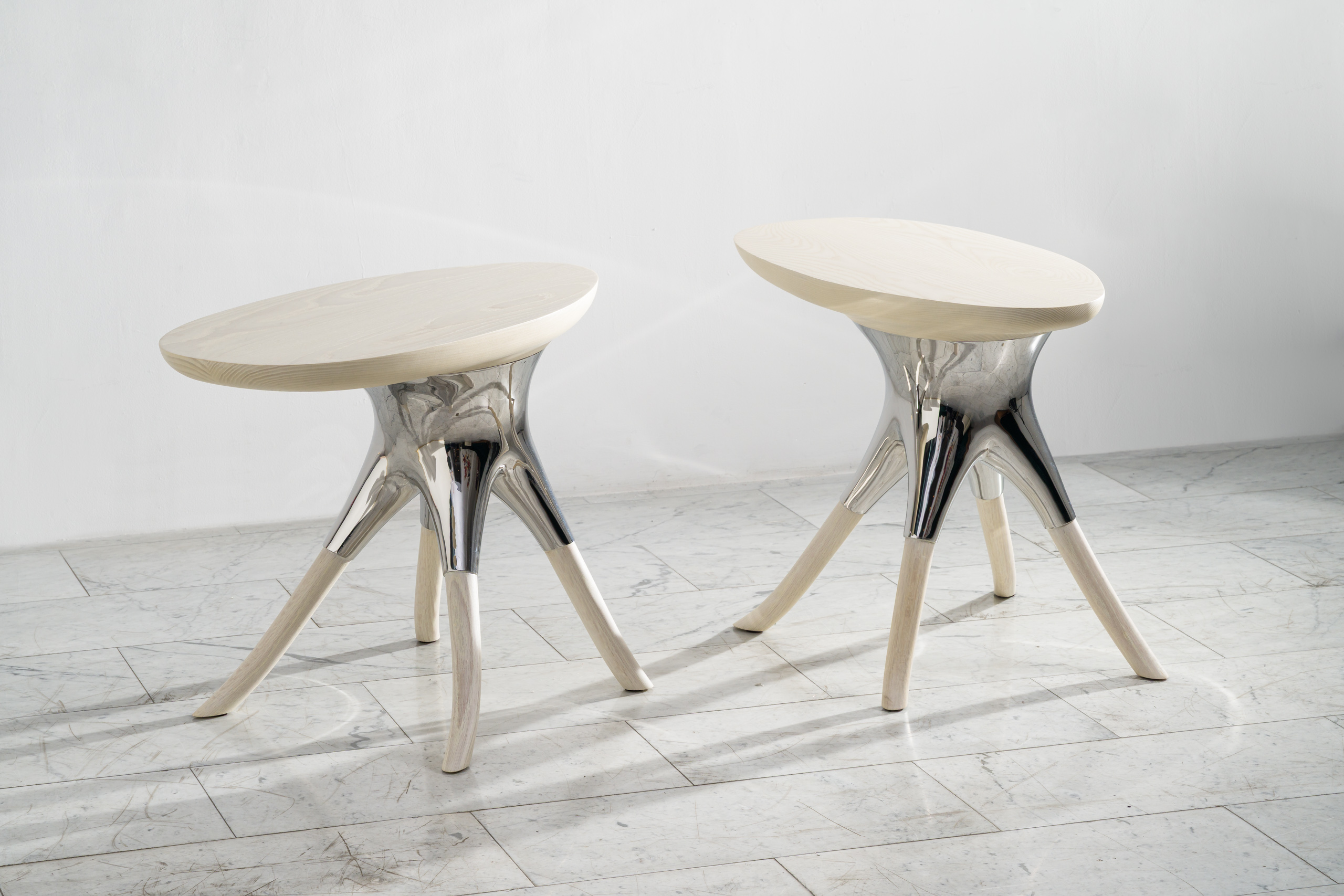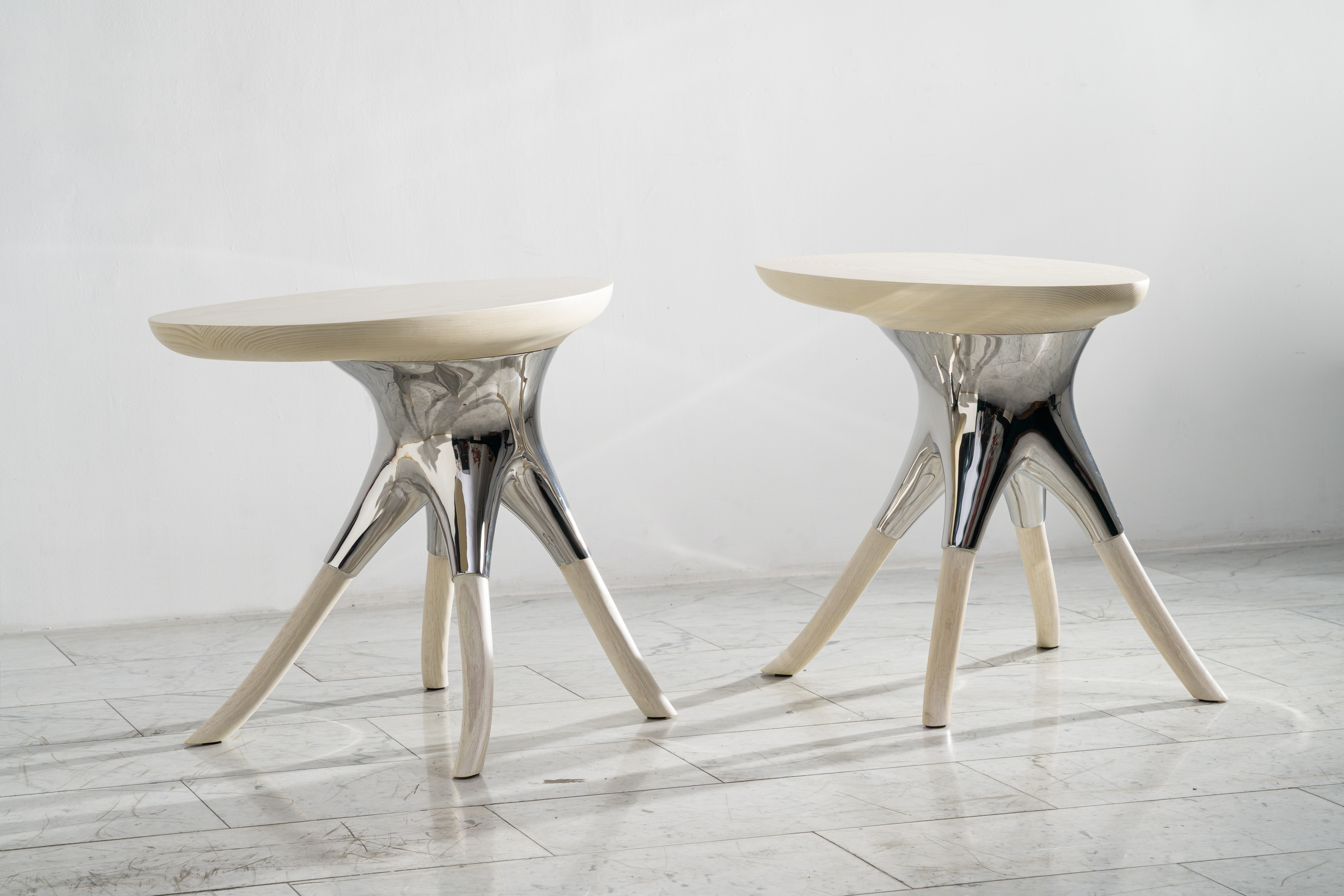 Alex Roskin, Racine Side Table in Stainless Steel, Ash and Oak, USA, 2025