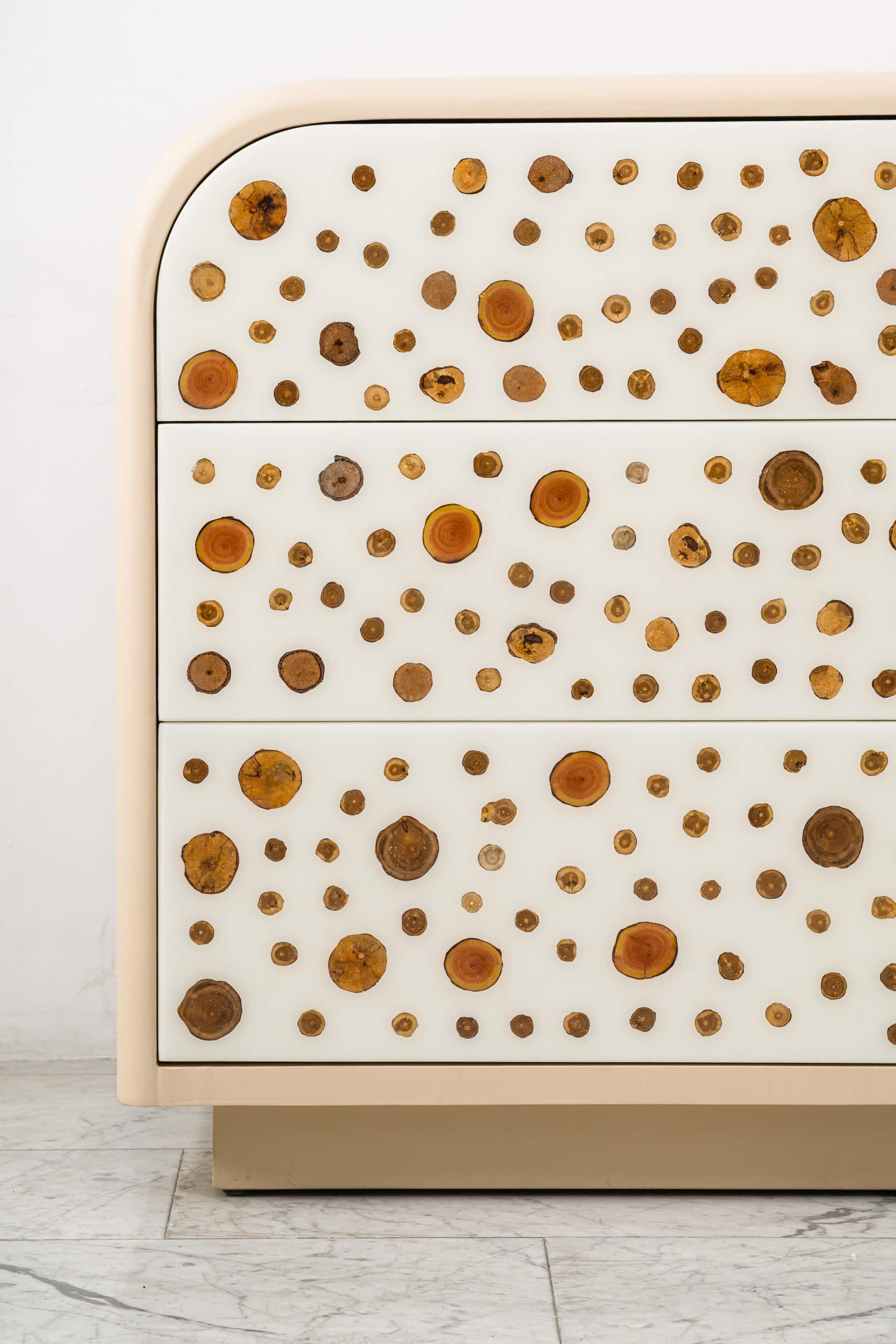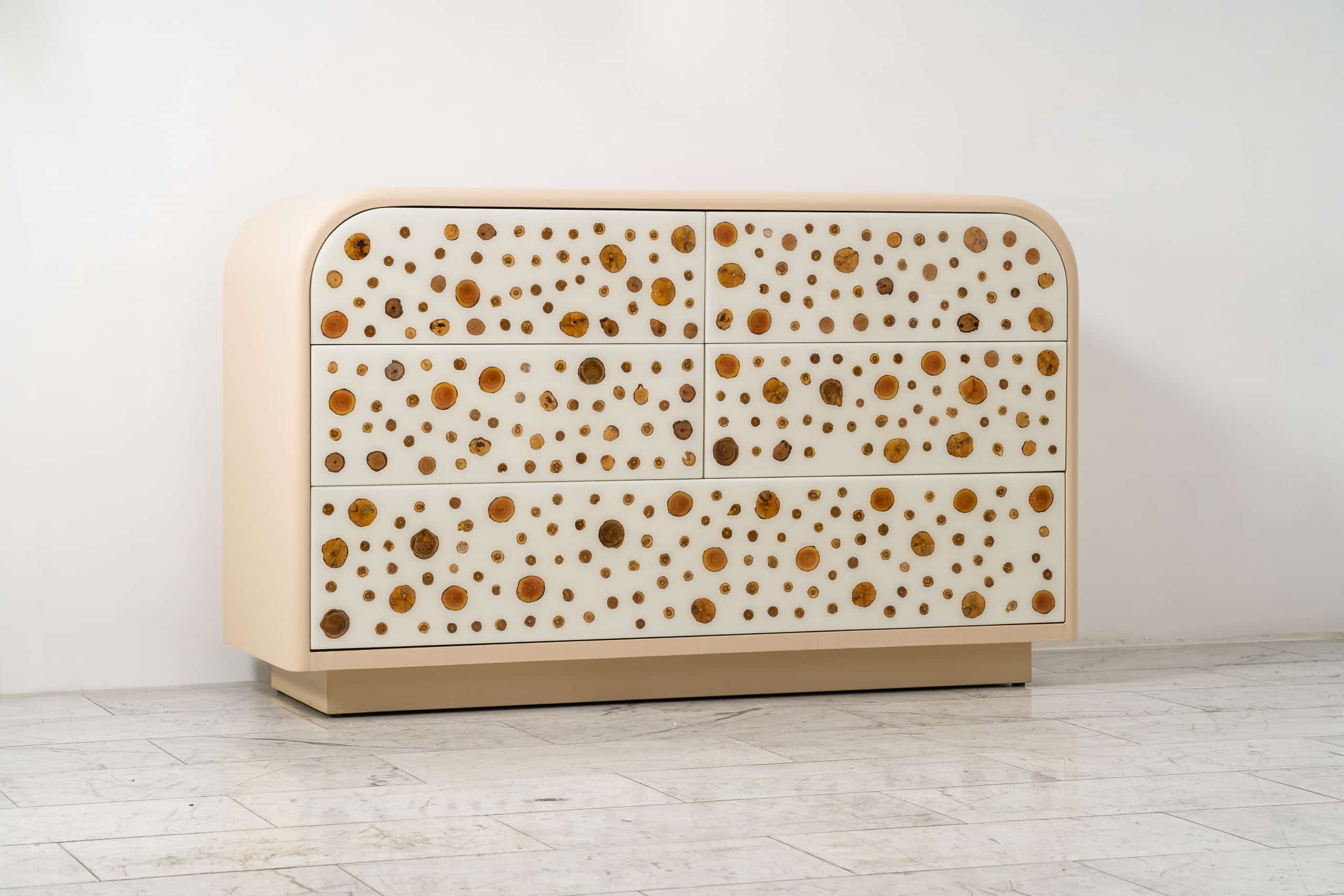 This sleek, sculptural cabinet by Djivan Schapira was handcrafted in resin with fruitwood end grain and suede-lined white oak drawers with dovetails is available by commission.