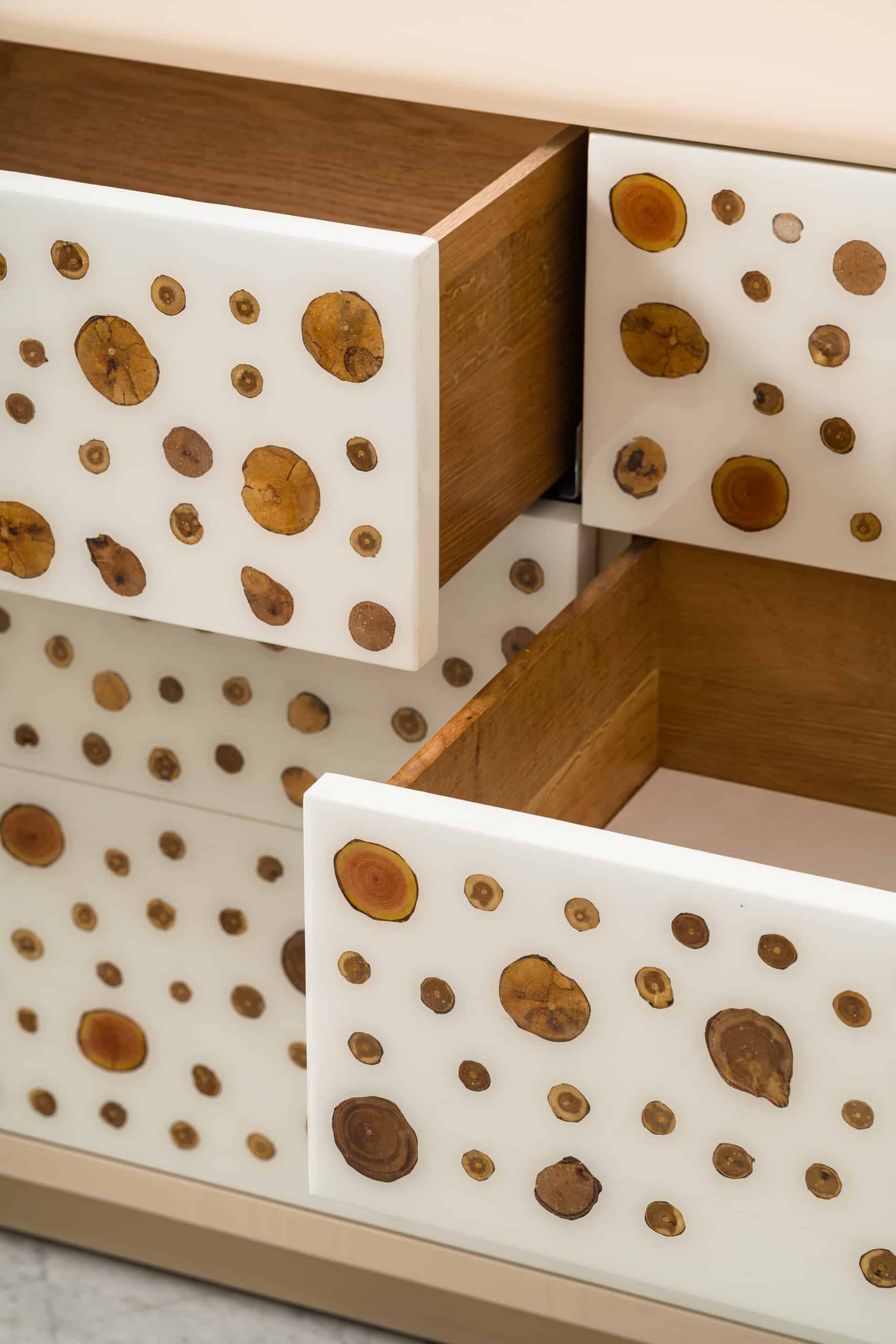 Each surface reveals a lyrical interplay between materials like warm wood grains suspended in luminous resin that create a piece that feels simultaneously modern and deeply tactile.