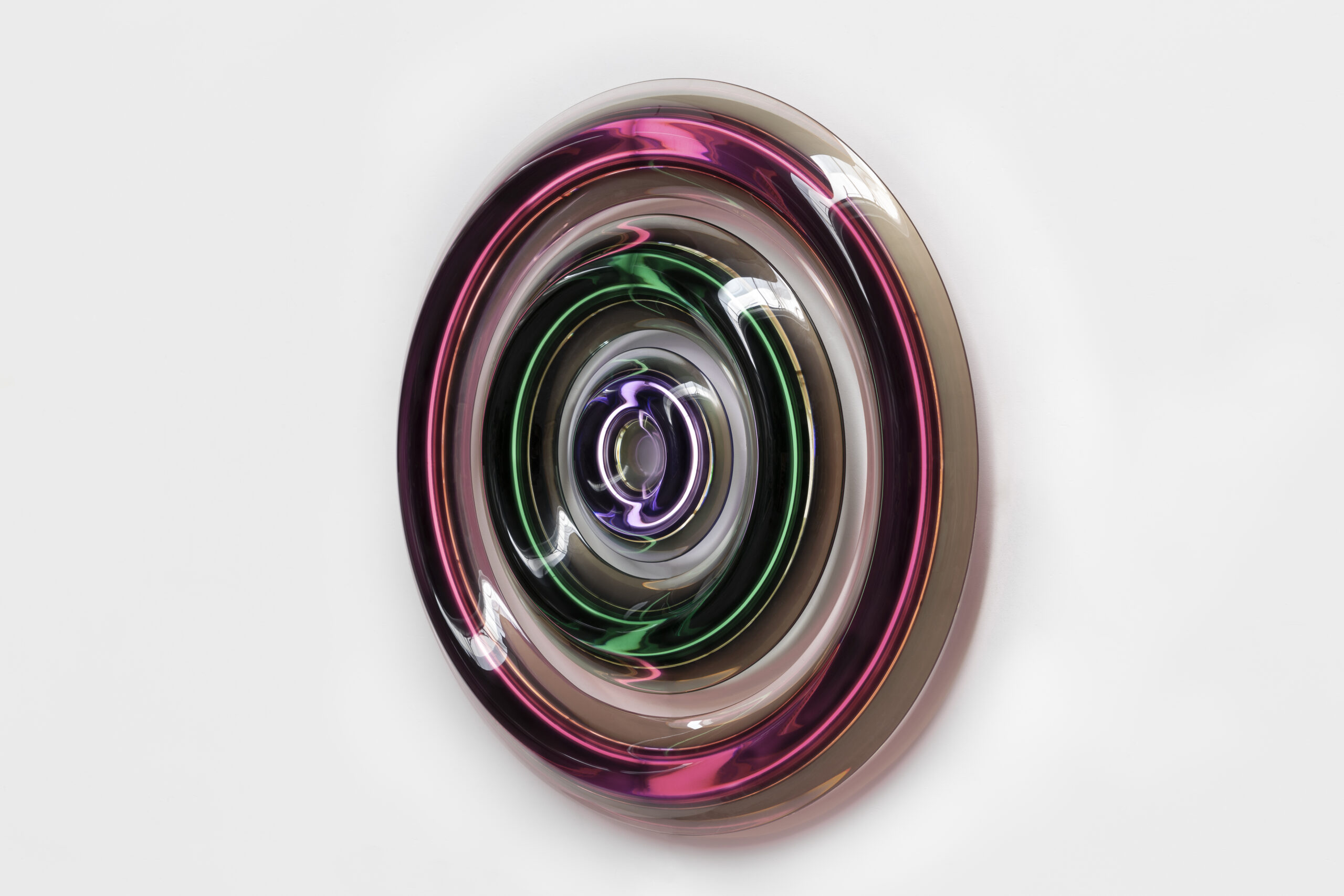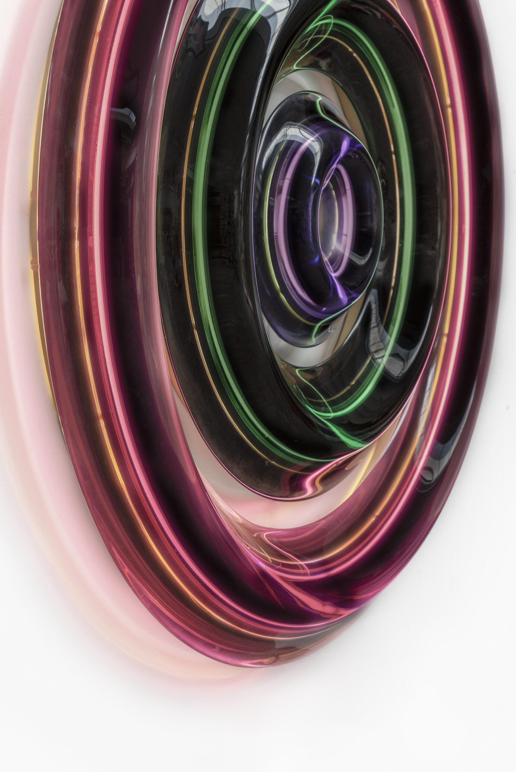 Inspired by the 1970s and the Space Age, this organic illuminated wall sculpture from Draga and Aurel, called Joy Circle, features a series of concentric dimmable neon rings embedded in combined layers of jewel toned epoxy resin. Complementary hues are layered to create a soft, blended glow effect when lit. Entirely handcrafted in their workshop in Como, Italy, Draga & Aurel have brilliantly synthesized varied references, such as Minimalism, Retro-Futurism, and Op Art to build an all-new collection focused on use of transparent materials as well as a deeper exploration of what transparency can mean in art and design. They have perfected the art of resin, achieving brightly hued, resin furniture, lighting, and accessories. Joy Circle is available in a wide range of vibrant size and colour variations, achieved after many tests in order to find the perfect combination of colours. Shown size at 47 inches is exclusive to Todd Merrill Studio