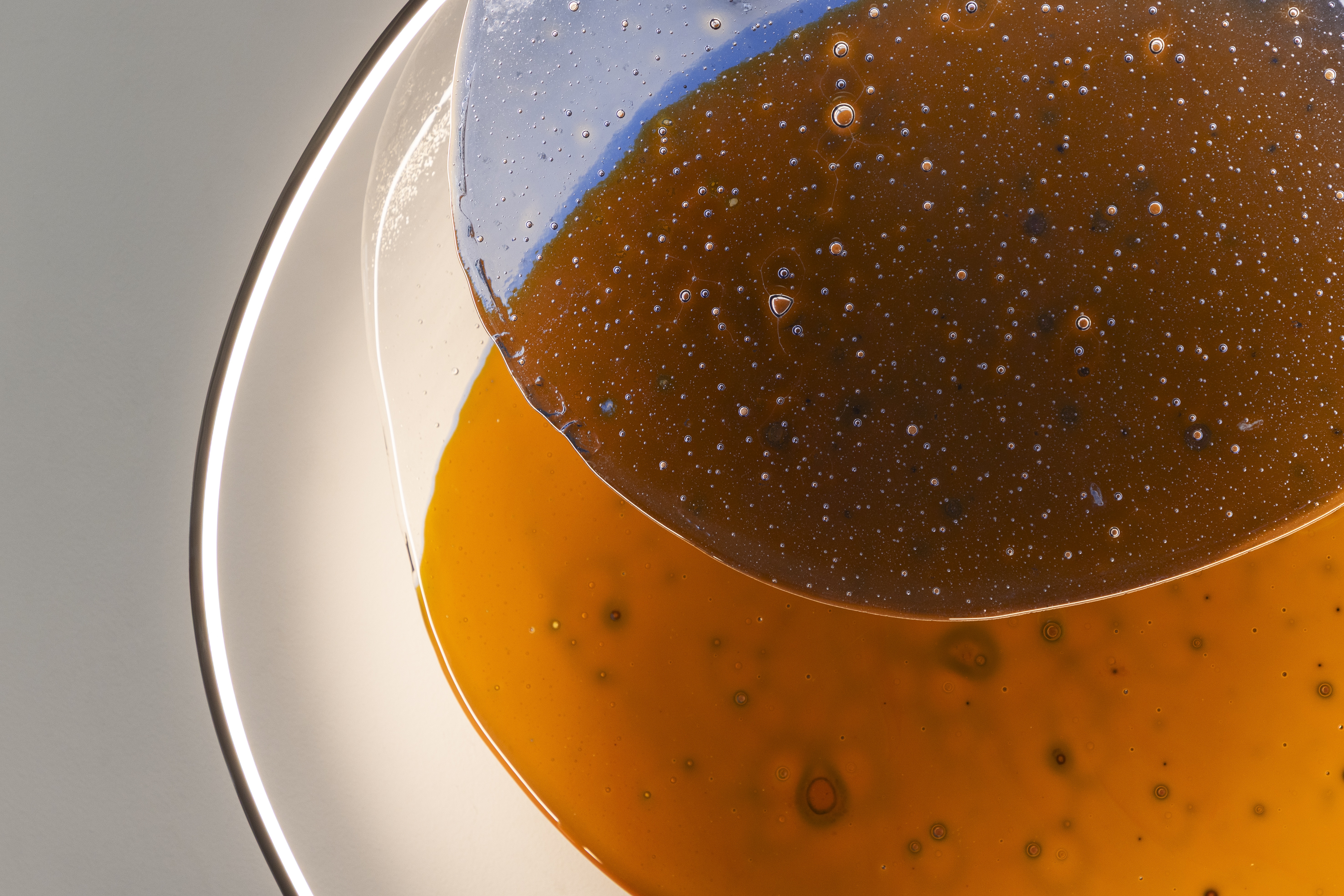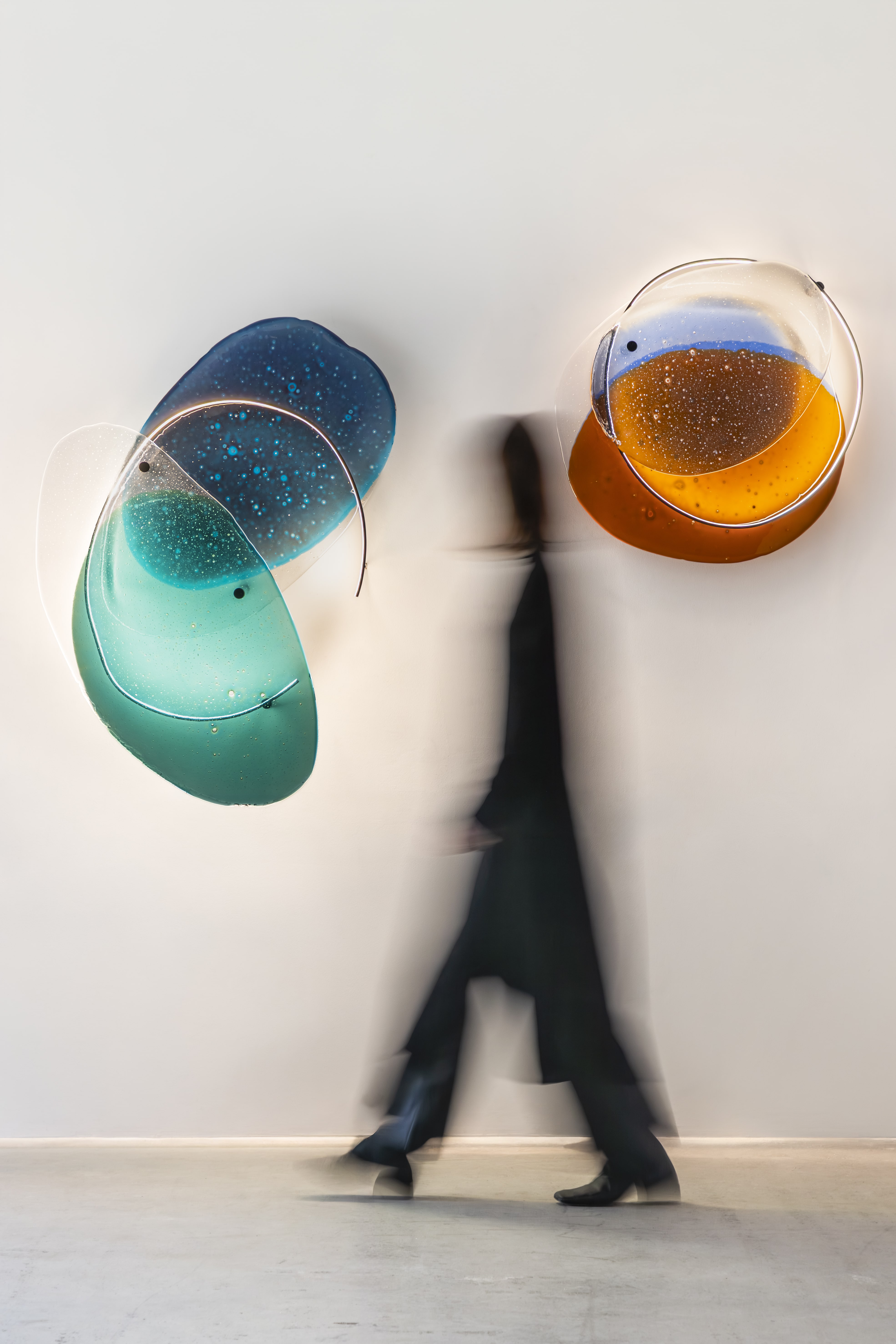 In Crisalide, Draga & Aurel explore light not merely as illumination, but as a transformative force. Overlapping chromatic layers of hand-blown glass form iridescent, ovoid bodies—shells of color that appear to hover between translucency and saturation. A fluid, precision-engineered LED line activates the works from within, tracing luminous gestures that shift and evolve as the viewer moves. The result is a poetic interplay of color, shadow, and radiance: a suspended moment between potential and manifestation.