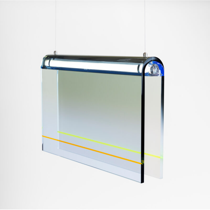 The Ribbon Lamps continue Draga & Aurelโs profound exploration of Lucite. The name is derived from the sinuous ribbonlike shape of acrylic resin that elegantly wraps around a LED-illuminated โpill.โ The graceful curve of the ribbon captures and reflects light, creating a dynamic visual effect. Colors appear to float across the lucite thanks to the interplay of light on the material. The pendants are currently available in a variation of three widths all of which will be on view at the fair. The Ribbon lamps are currently available in two color variations – lavender and lilac grey with neon highlights and an oceanic turquoise palette pierced through with the same blazing green and citrine highlights.