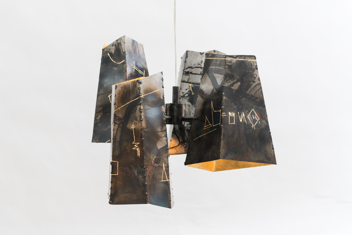 Four hand-built steel shades suspend in the air at various heights creating an organic cluster of asymmetric forms. Each shade is cut and welded individually, before patinas are applied. An abstract language of semi-pictographic images is incised into the facets of the shades, and inlaid with 24kt god.