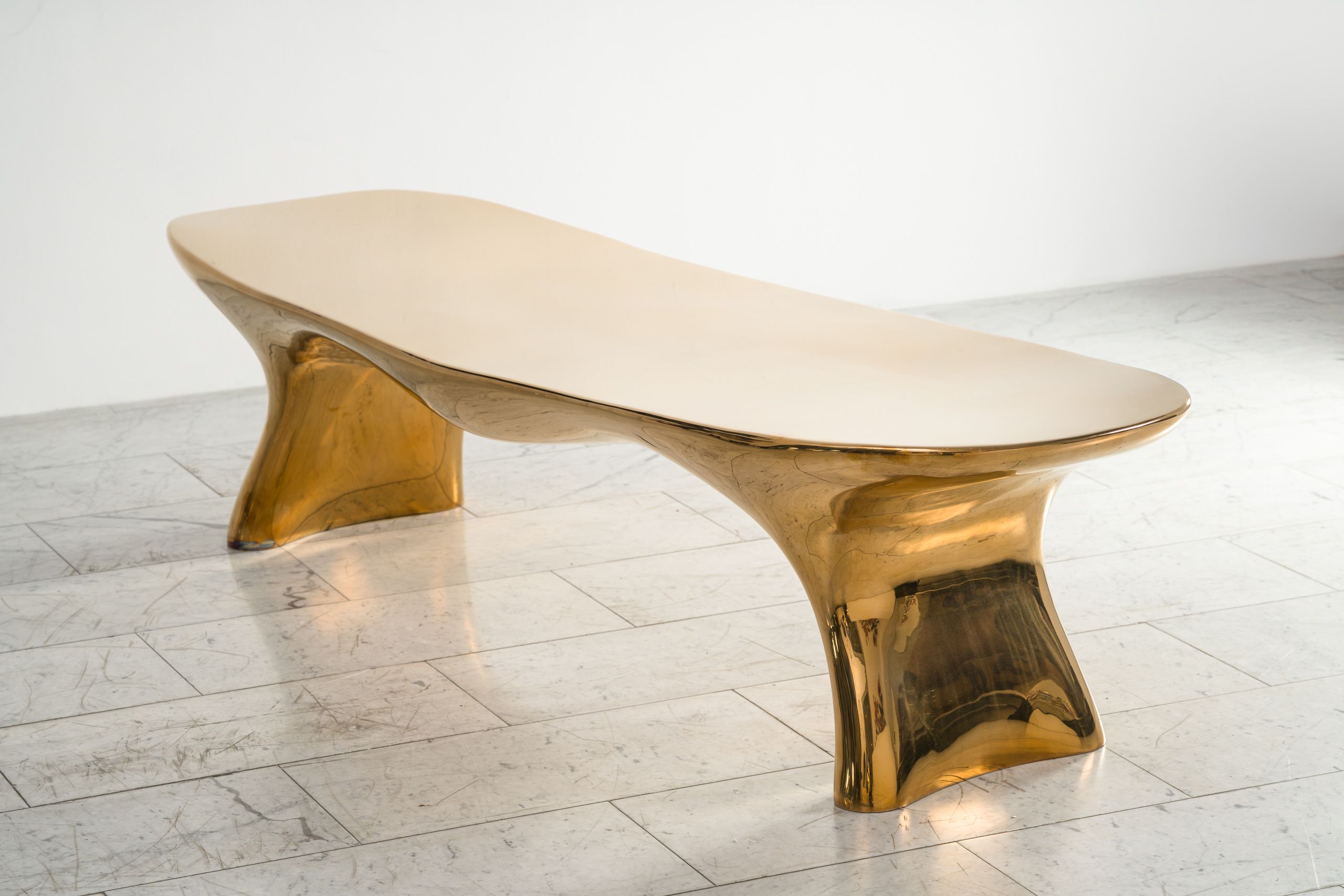 The Cerf Bench‘s muscular sculpted shape is cast in mirror-polished bronze. The bench’s seat is contoured to contrast the belly of the bench.