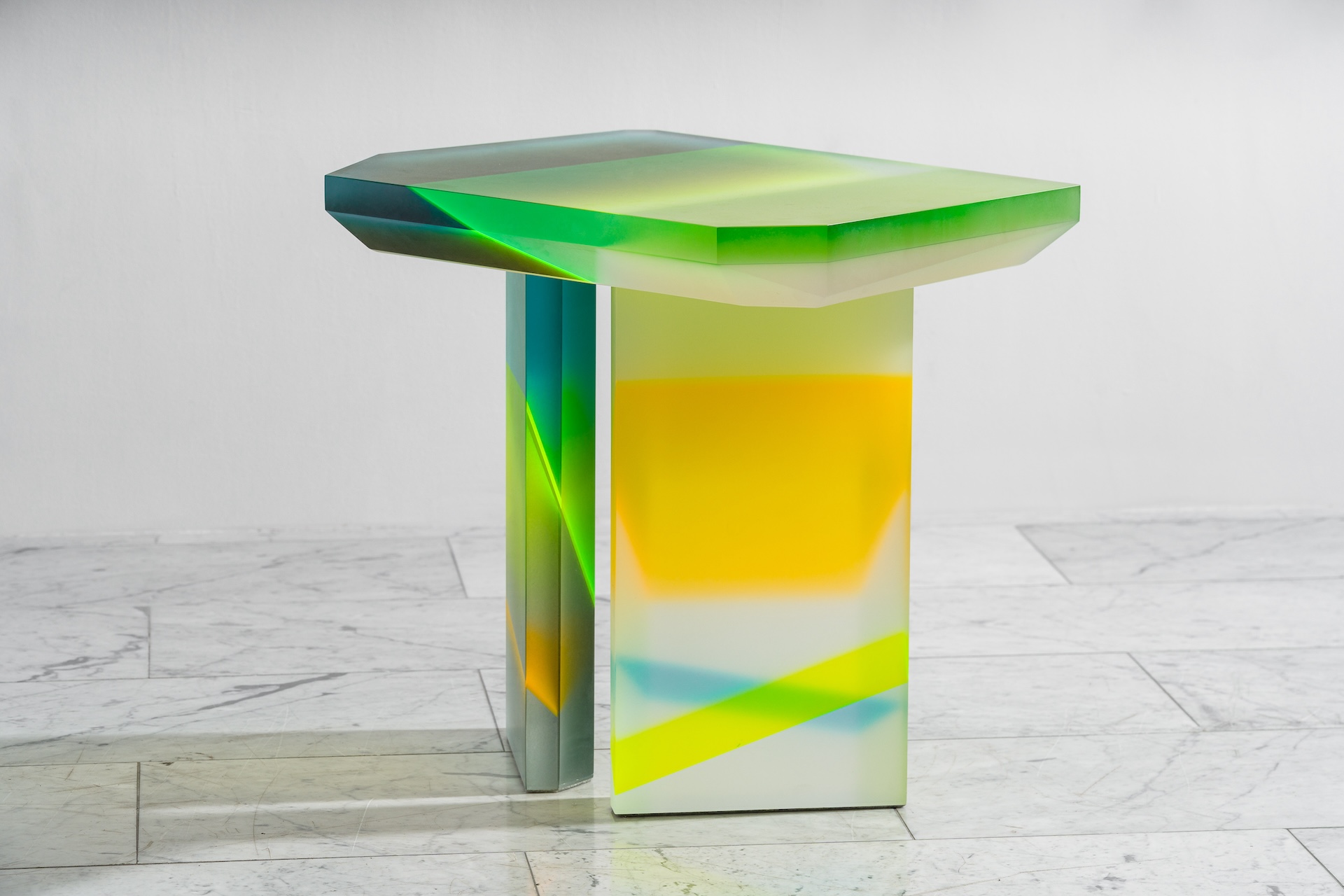 Flare epitomizes the duo’s deep dive into the interplay of color and light refraction. Through a rigorous study of materials and their capacity to come alive with color and light, Draga & Aurel have created a material process that imitates internal illumination created as opposing colors react to ambient light . Their mastery in epoxy resin artistry is globally acknowledged, and in this project, they push their creative boundaries further by embracing Lucite. This acrylic material undergoes a painstaking process, with skilled artisans from Lake Como collaborating closely with the duo in their studio.